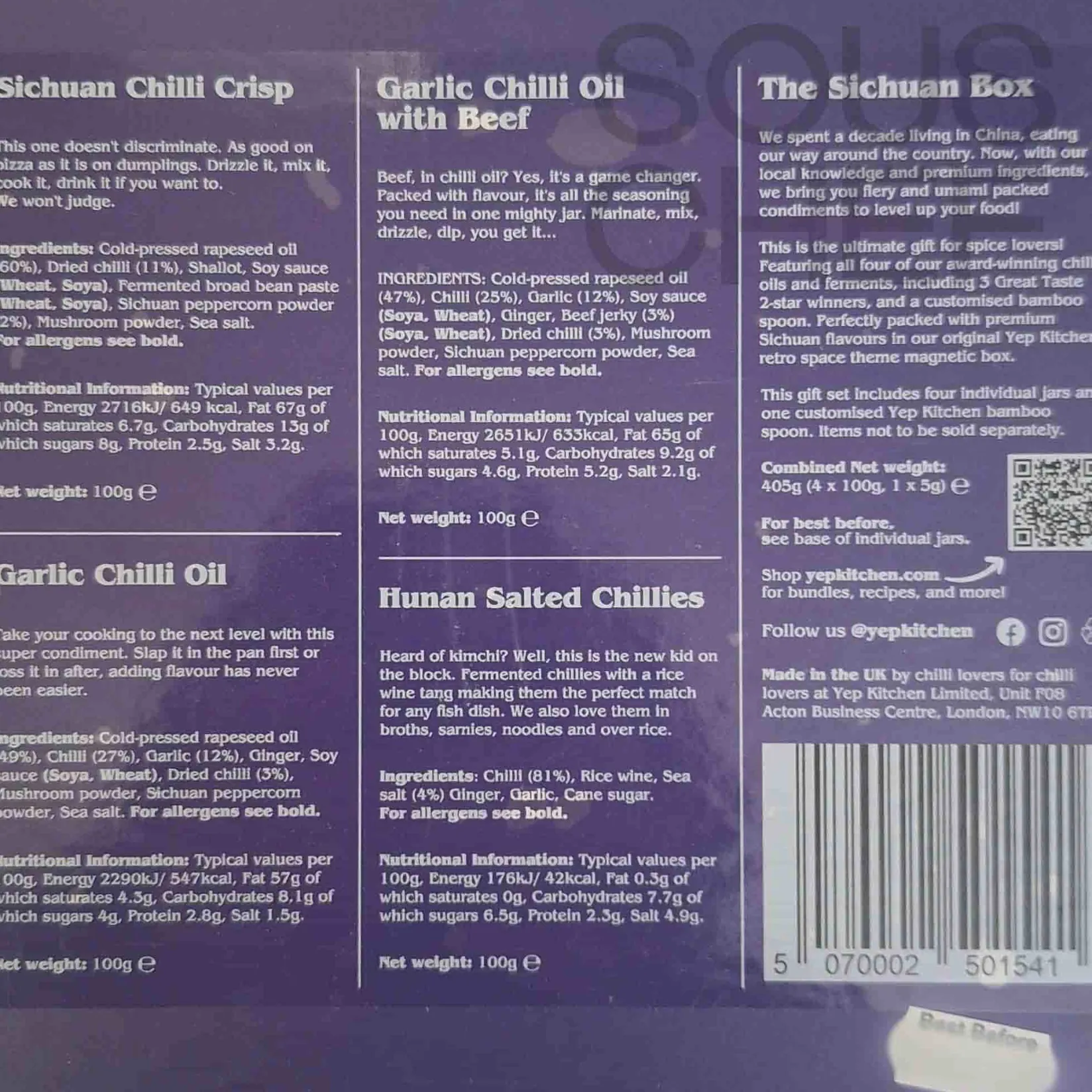 Product formulations and details may change. For the latest ingredients and allergen information always check product packaging prior to consumption. Ingredients: Sichuan chilli crisp: cold-pressed rapeseed oil, dried chilli, shallot, soy sauce (wheat, soya), fermented broad bean paste (wheat, soya), sichuan peppercorn powder, mushroom powder, sea salt. Garlic chilli oil: cold-pressed rapeseed oil, chilli, garlic, ginger, dried chilli, soy sauce (soya, wheat), sichuan peppercorn powder, mushroom powder, sea salt. Garlic chilli oil with beef: cold-pressed rapeseed oil, chilli, garlic, beef jerky, ginger, dried chilli, soy sauce (soya, wheat), sichuan peppercorn powder, mushroom powder, sea salt. Hunan salted chillies: chilli, sea salt, rice wine, ginger, garlic, cane sugar.