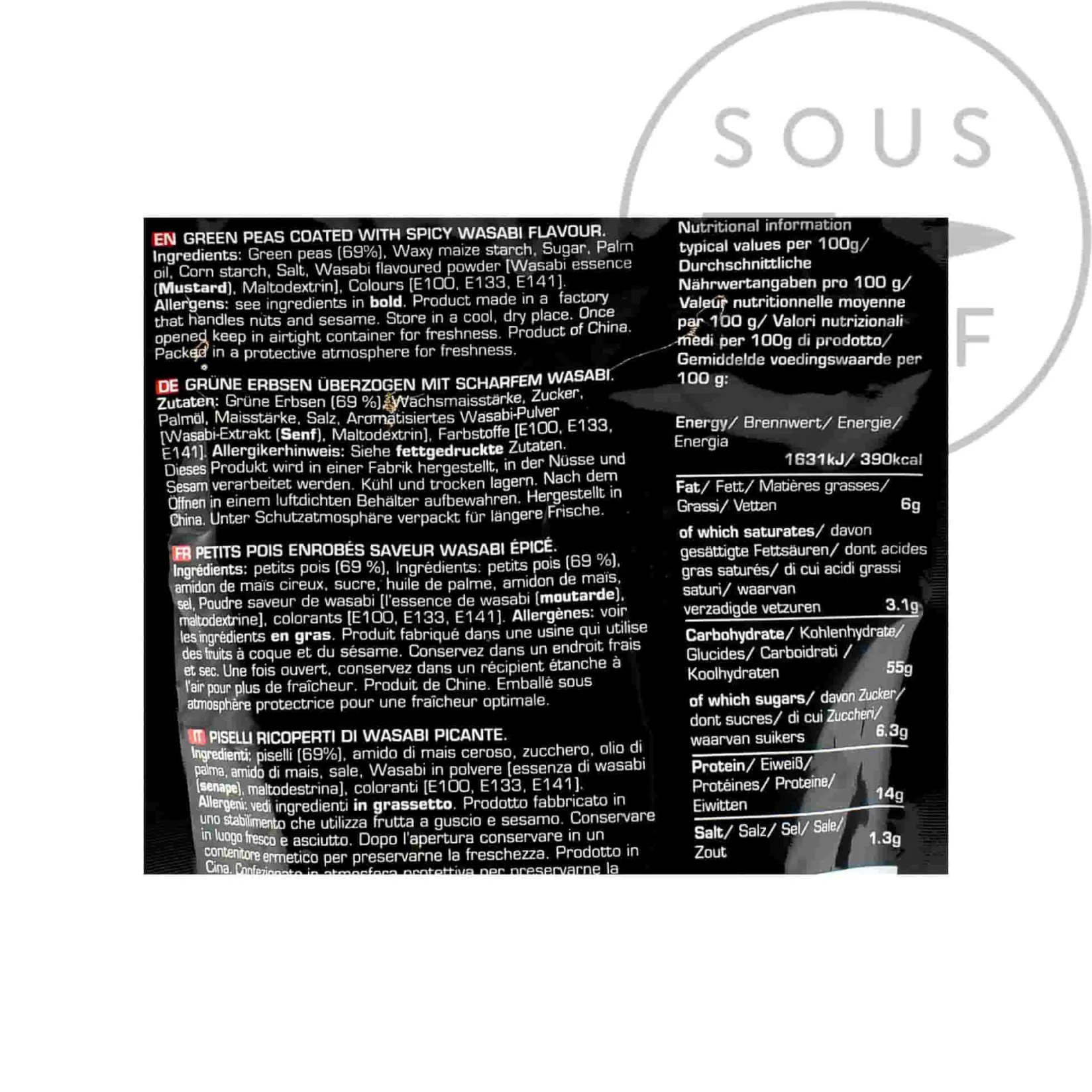 Product formulations and details may change. For the latest ingredients and allergen information always check product packaging prior to consumption. Ingredients: Green peas (69%), Waxy maize starch, Sugar, Palm oil, Corn starch, Salt, Wasabi flavoured powder [Wasabi essence (Mustard), Maltodextrin], Colours [E100, E133, E141].