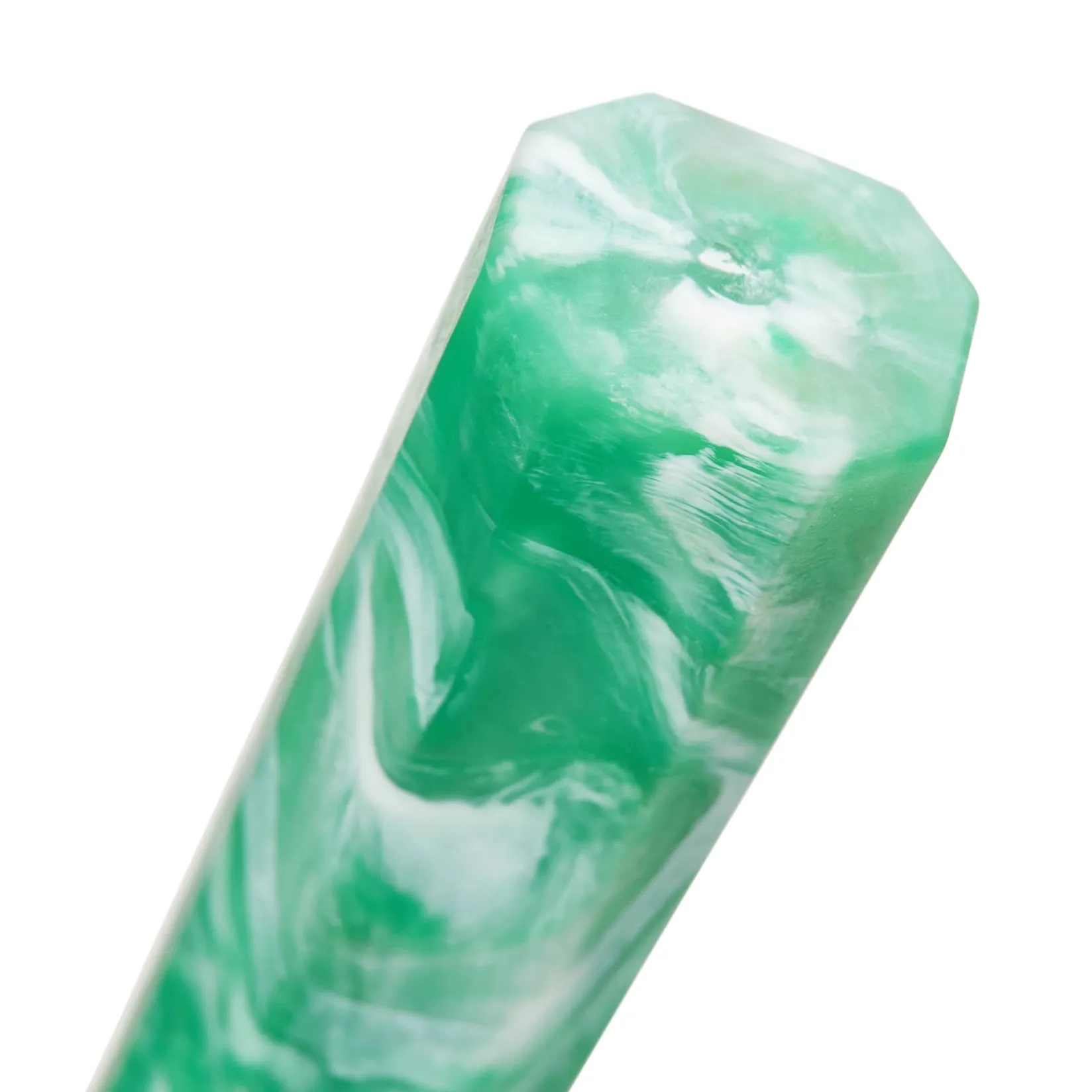 The handle is made from waste plastic from Maldon sea salt containers. The octagonal shape and mint green colour make it a beautiful addition to your table. No two handles are the same, so each knife has its own unique pattern.
