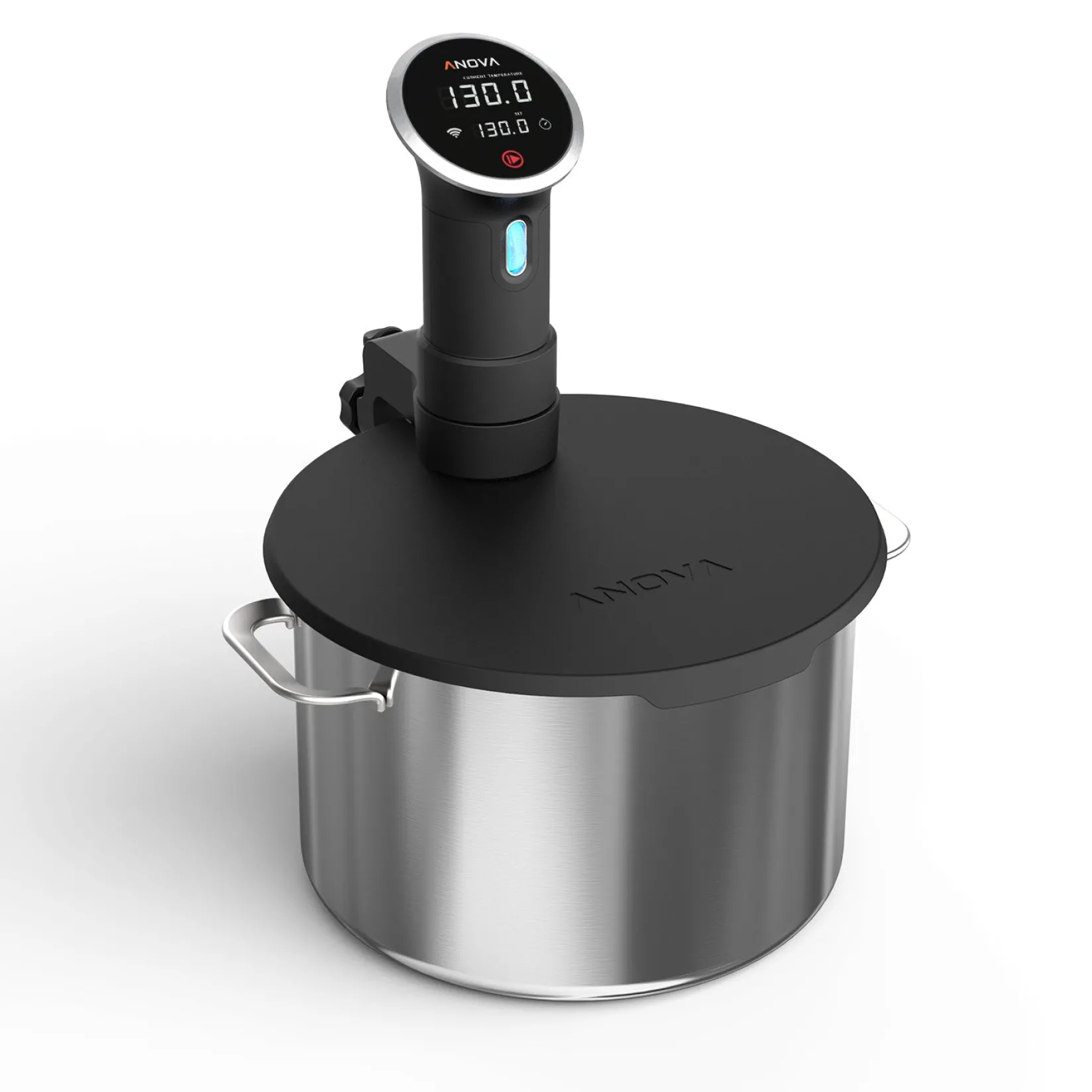 The Anova Sous Vide pan lid is made from silicone and forms a tight seal over your pan, as you heat the water using any Anova sous vide cooker. Using this lid keeps the water at a more consistent temperature and reduces heat loss – increasing efficiency and precision.