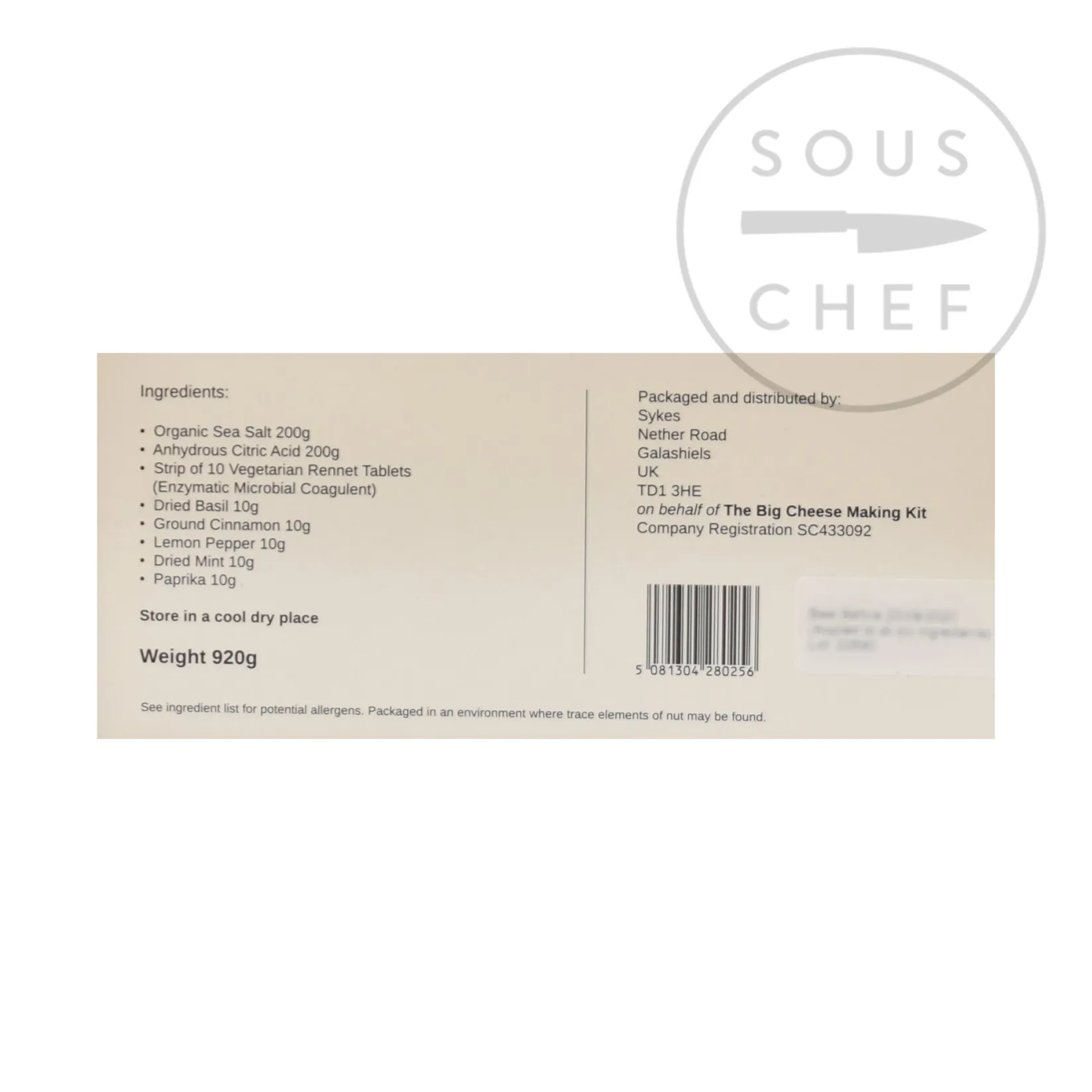 Included in the kit are: organic sea salt, citric acid, vegetarian rennet tablets, butter muslin, a dairy thermometer, herbs & spices (so you can customise your cheese), 3 cheese moulds and an instruction, guide & recipe booklet.