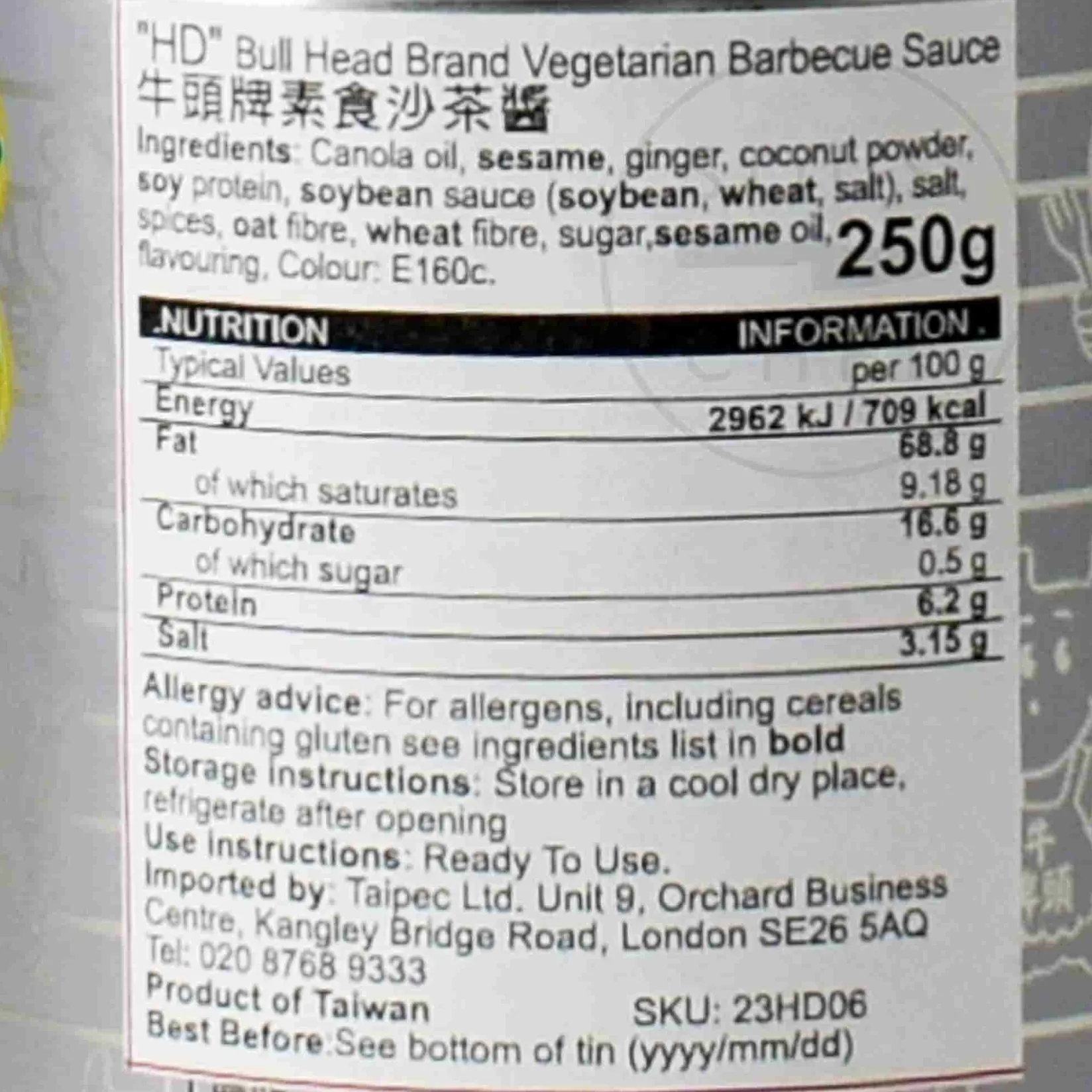 Bull Head vegetarian BBQ sauce gives you all the robust, rich flavours of a BBQ sauce, without using any meat or fish products. A blend of soybean oil, sesame, ginger and chilli powder gives this sauce its hot and punchy balance of flavours.