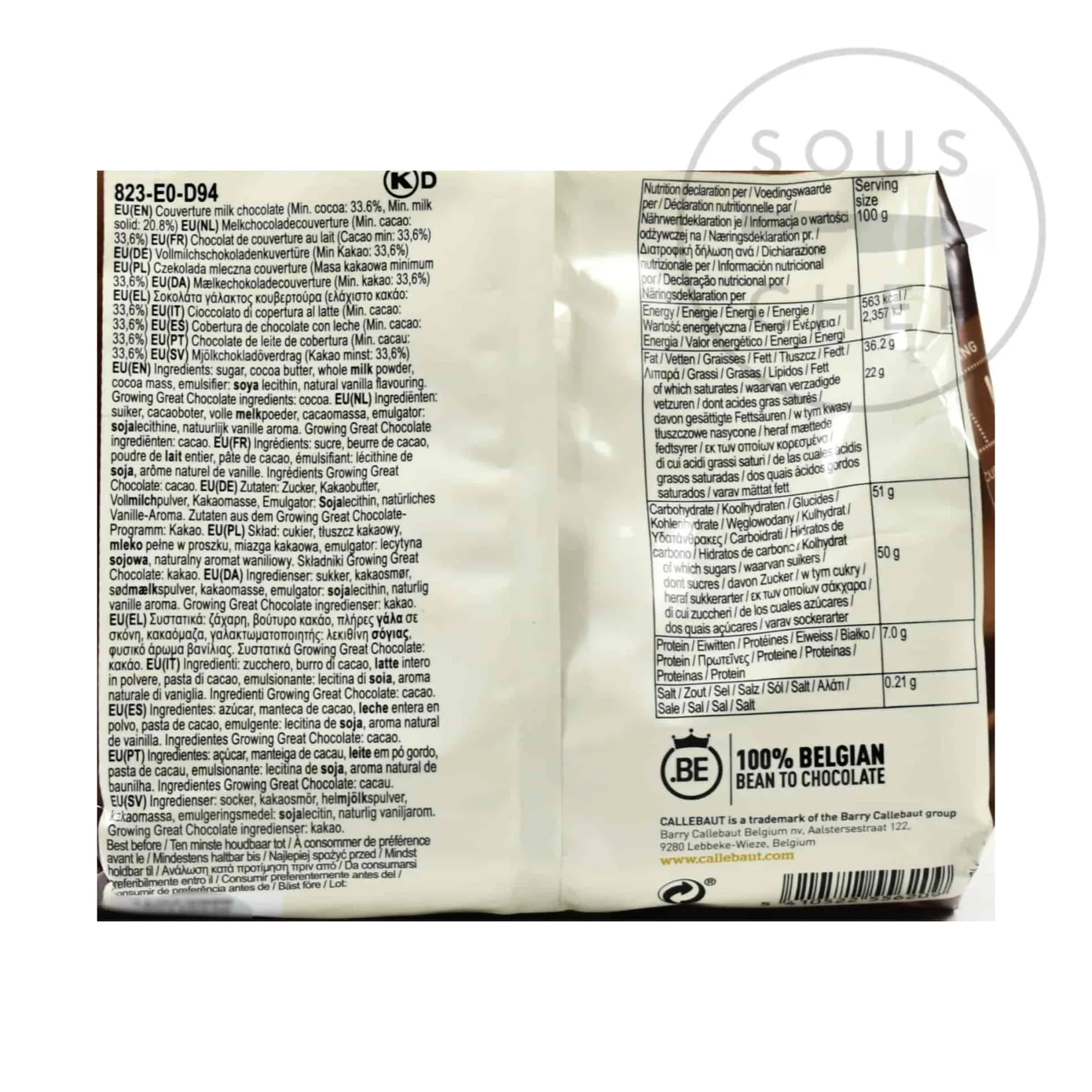 Milk chocolate couverture is used in professional kitchens as the chocolate pieces can be heated quickly, easily and consistently. The chocolate is pre-tempered and, being couverture chocolate, has a over a 31% fat content. This ensures a quality, glossy chocolate which has a clean ‘snap’. Take care when melting the milk chocolate couverture – if heated above 31 degrees celius it may need to be tempered again to set perfectly. To avoid this simply melt the milk couverture chocolate slowly over a bain-marie stirring regularly until melted.