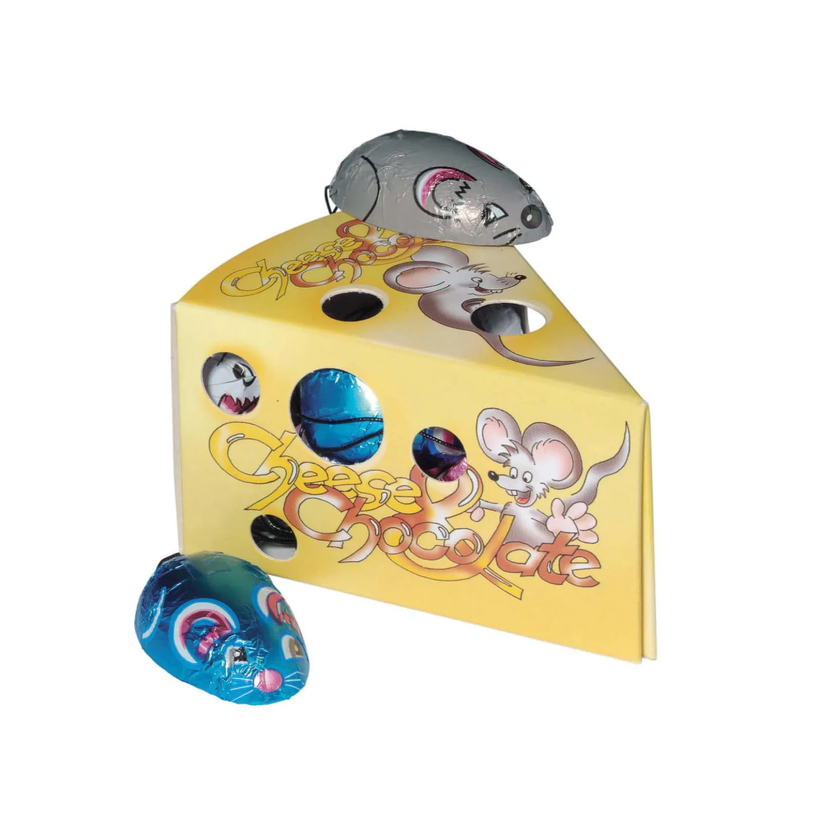 This “Cheese Wedge” chocolate is a fun chocolate snack. The creamy milk chocolates are wrapped in colourful, mouse-illustrated foil, then packaged in a cardboard ‘cheese’ wedge. Add these wrapped chocolates to homemade pinatas and Christmas stockings.