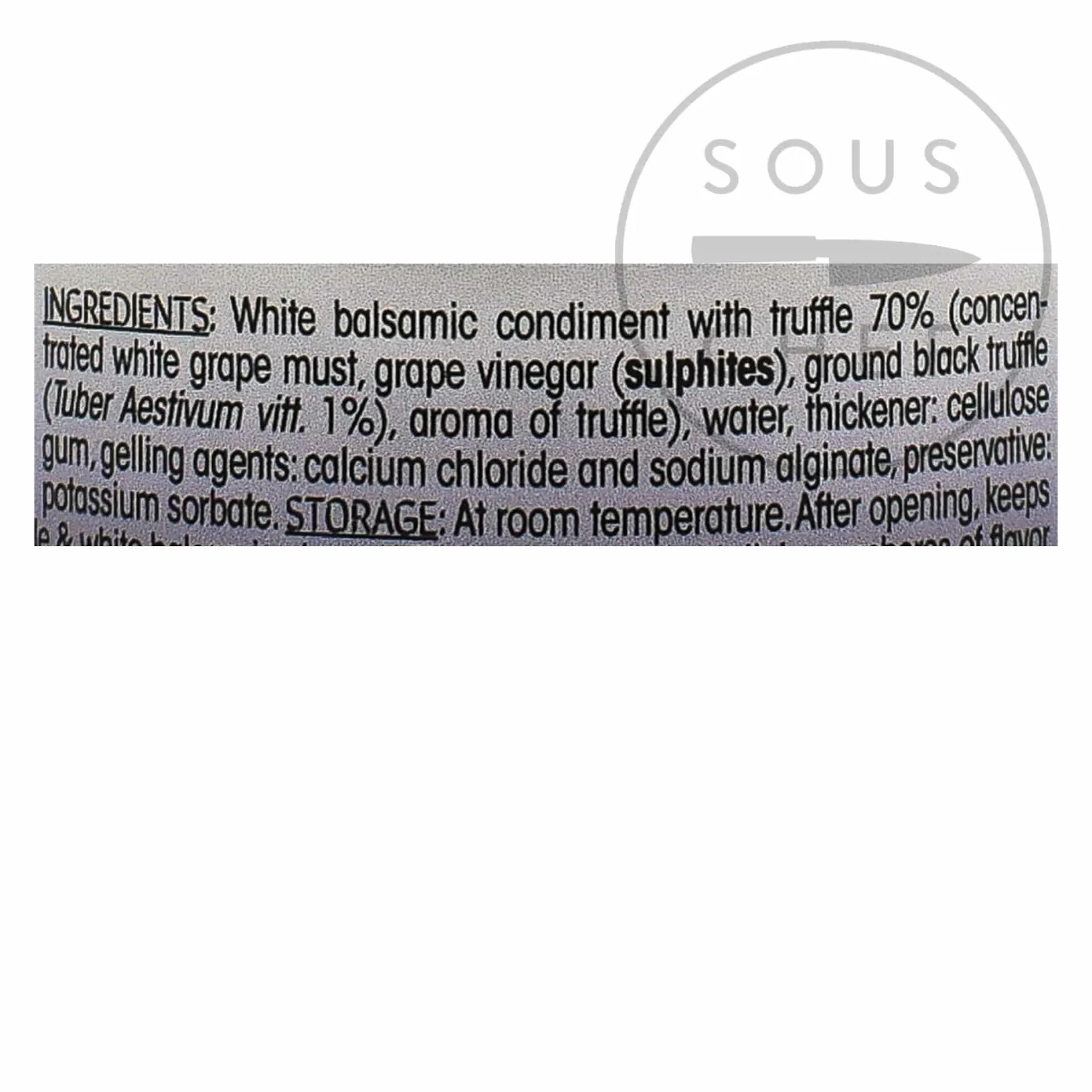 Product formulations and details may change. For the latest ingredients and allergen information always check product packaging prior to consumption. Ingredients: White balsamic condiment with summer truffle 70% (concentrated white grape must, grape vinegar (sulphites), summer truffle 1% (Tuber Aestivum vitt.), aroma of truffle), water, thickener: cellulose gum, firming agent: calcium chloride, gelling agent: sodium alginate.