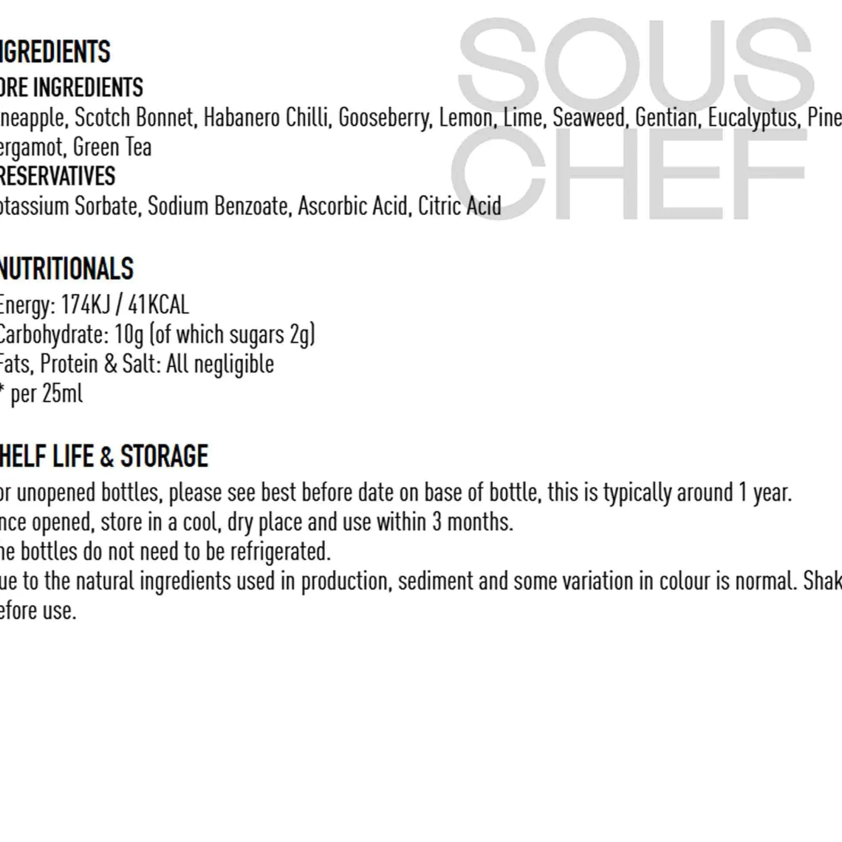 Product formulations and details may change. For the latest ingredients and allergen information always check product packaging prior to consumption. Ingredients: Natural macerates (gentian, scotch bonnet, green tea, seaweed, black pepper) fruit concentrates (pineapple, apple, gooseberry, lemon, lime) juices (ginger) natural extracts (eucalyptus, pine, bergamot, chilli) vegetable glycerin, water. preservatives: potassium sorbate, sodium benzoate, ascorbic acid, citric acid