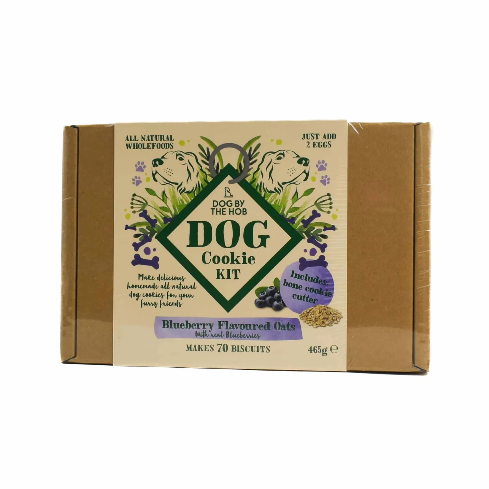 Once you’ve rolled out the dough, the cookies take 15-20 minutes to bake. The kit includes a bone-shaped cookie cutter but you can also use your own cutters. The blueberry and oat biscuits are great for snacking and training your dog.