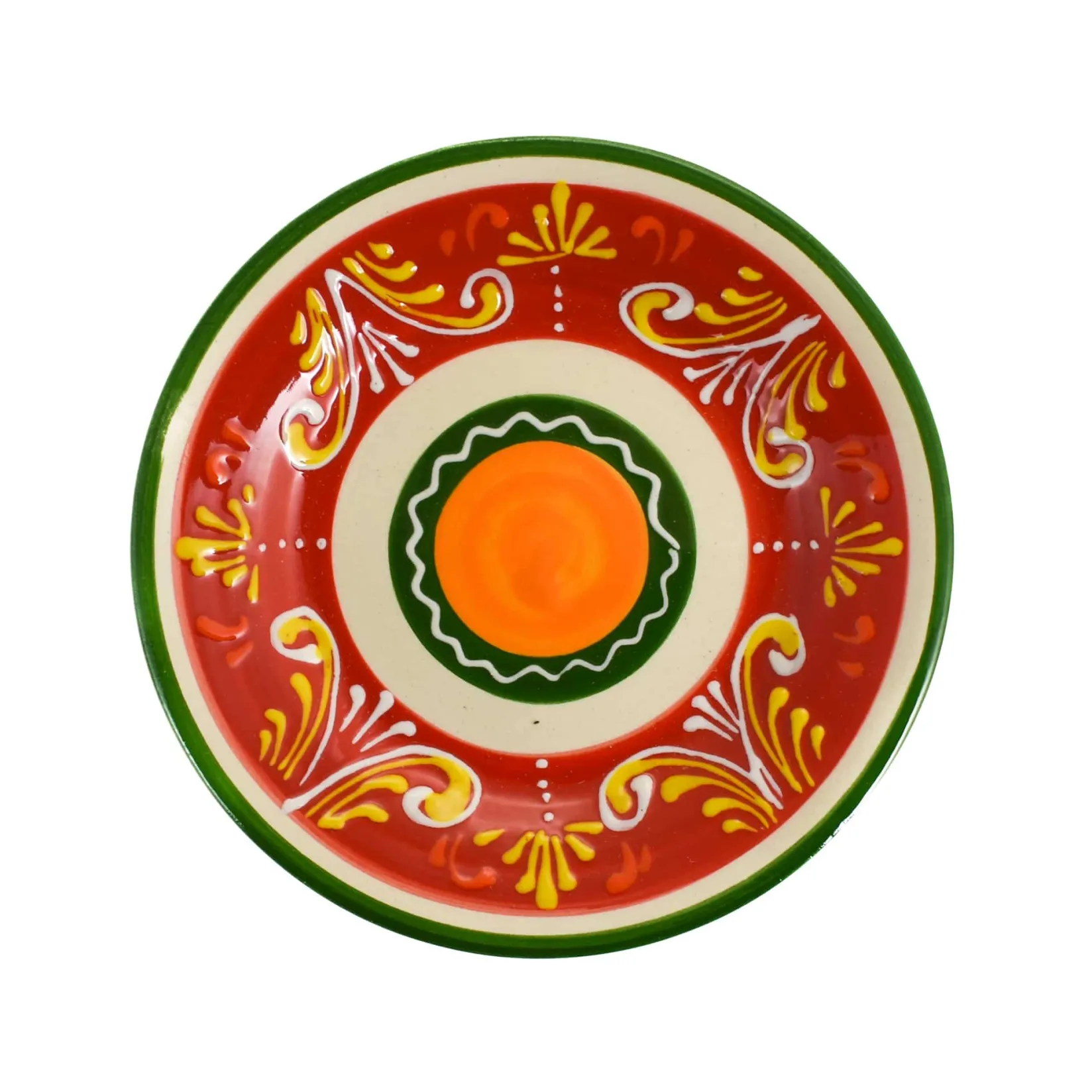 Each plate has a green rim and traditional hand-painted designs. The vibrant shades of red and yellow will transport you to the tapas bars of Seville and Madrid. The plate looks fantastic on a shelf when not in use.