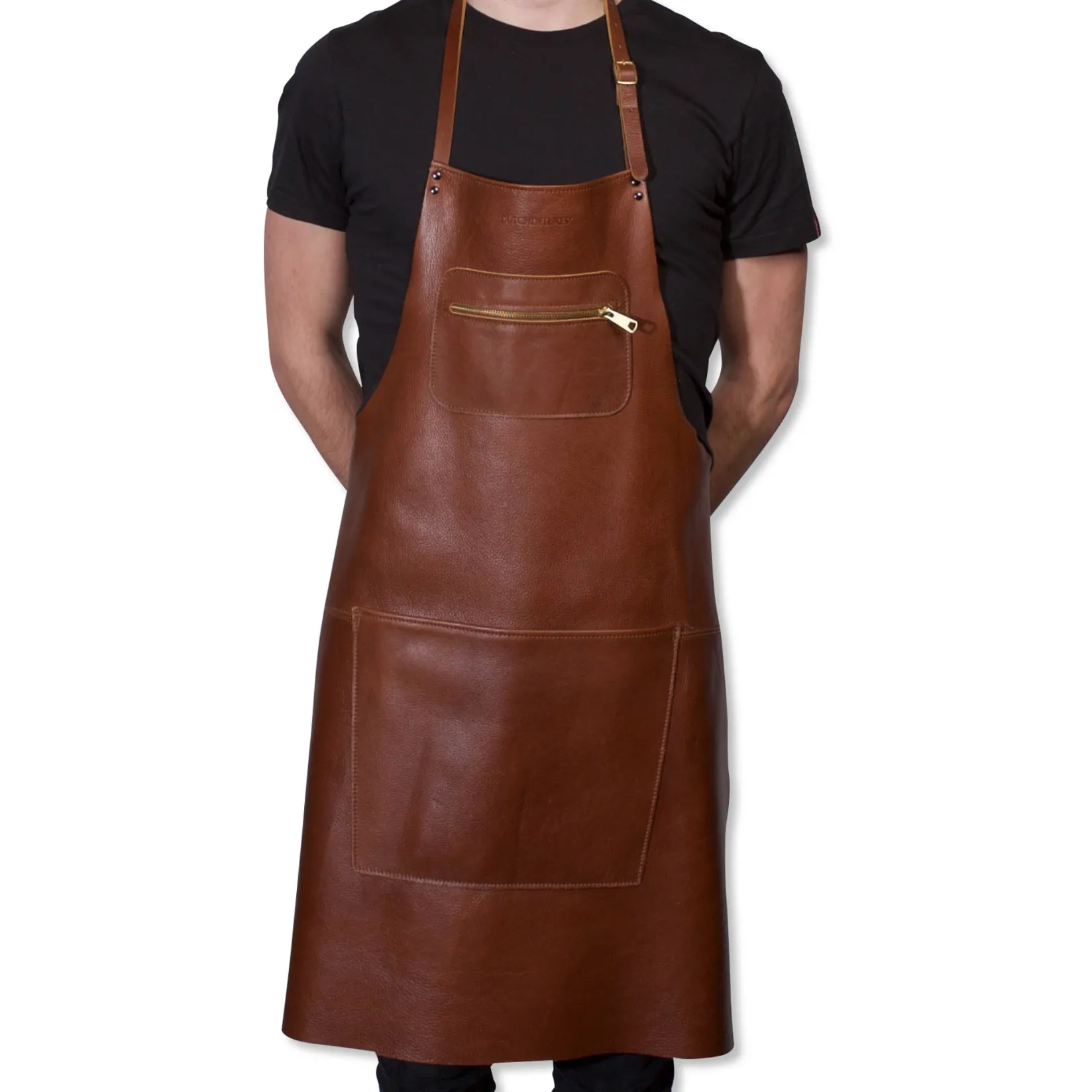 The Dutchdeluxes leather zipper apron in classic brown is so stylish and comfortable, you may never want to take it off. The mahogany-coloured leather seems to have its own inner glow and will make even a quick mid-week dinner feel like a special occasion.