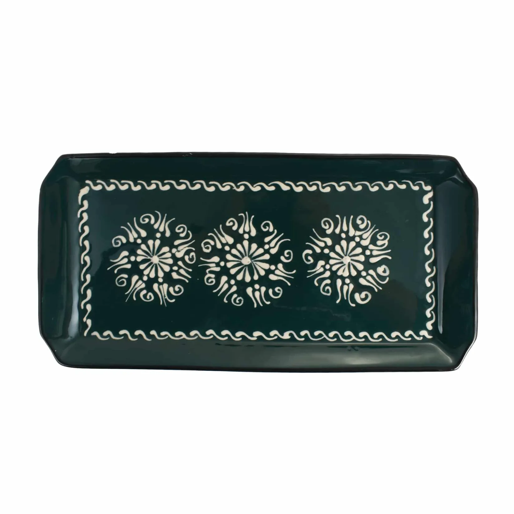 The rectangular tray features an intricate design on a deep green background. Pair it with other green and white crockery for a colourful tablescape.