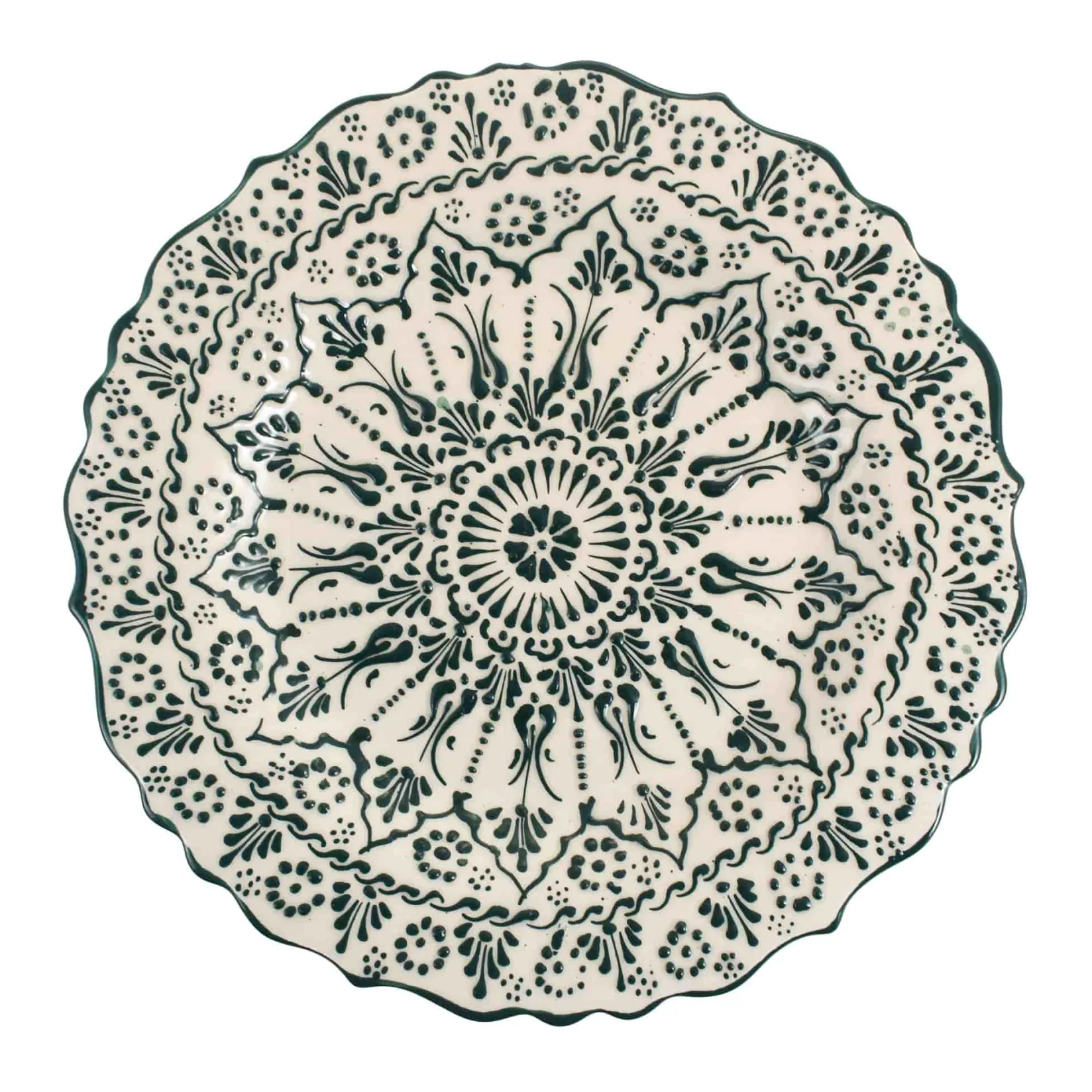 This stylish serving platter is handmade in Turkey. It features wavy sides and an intricate hand-painted design.