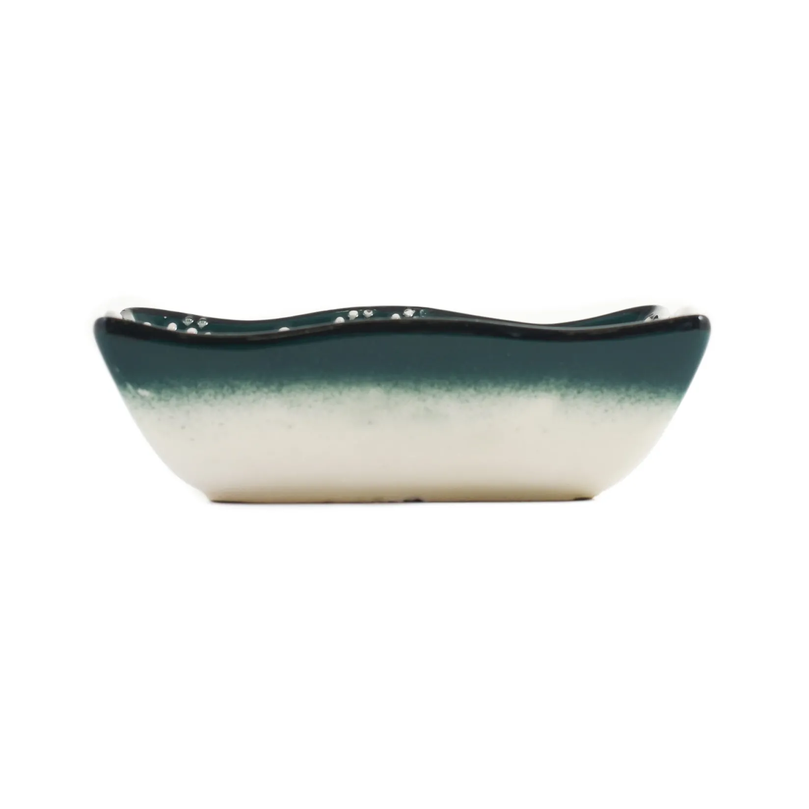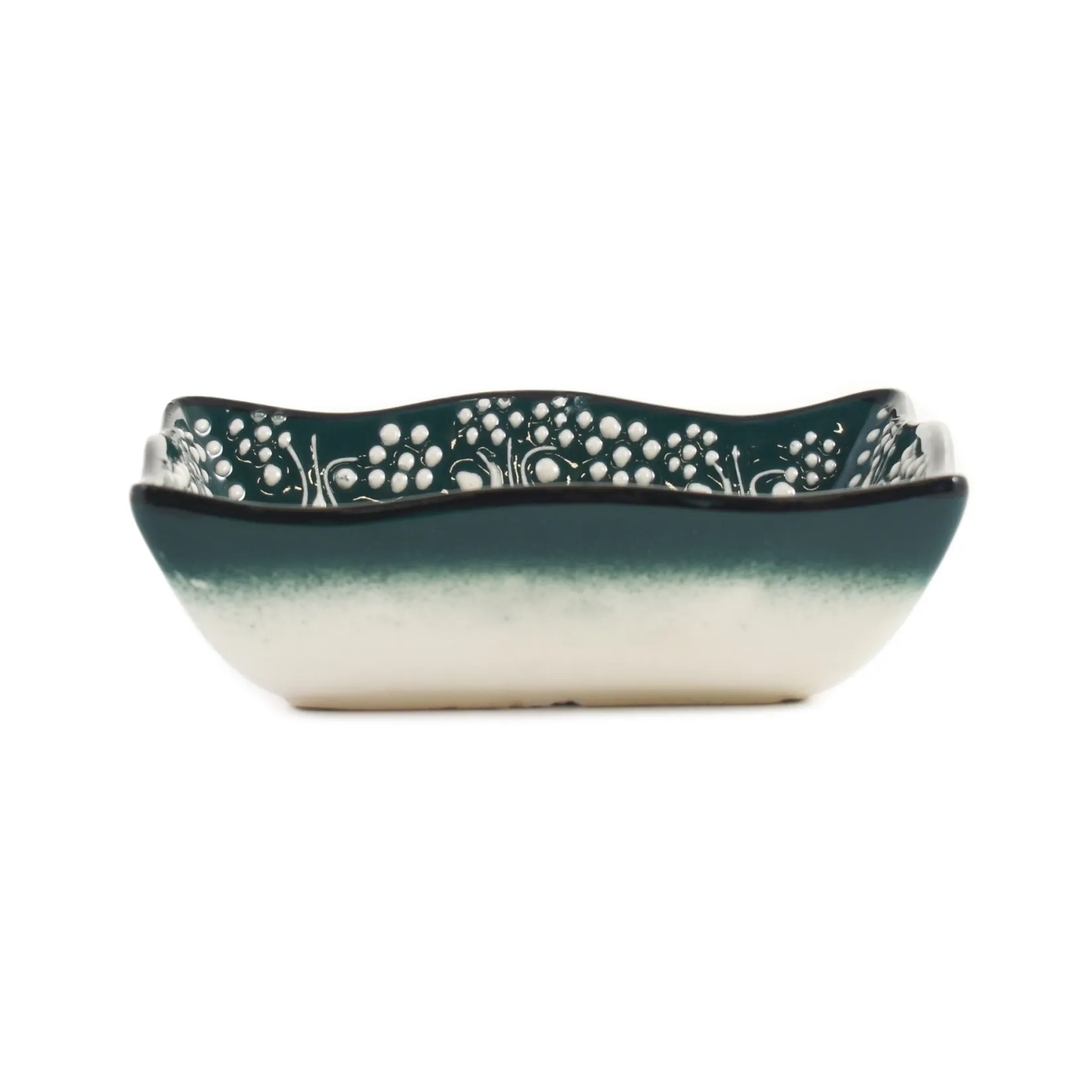 This Turkish snack dish has wavy edges and an intricate white design. Its deep green colour is a striking alternative to plain white tableware.