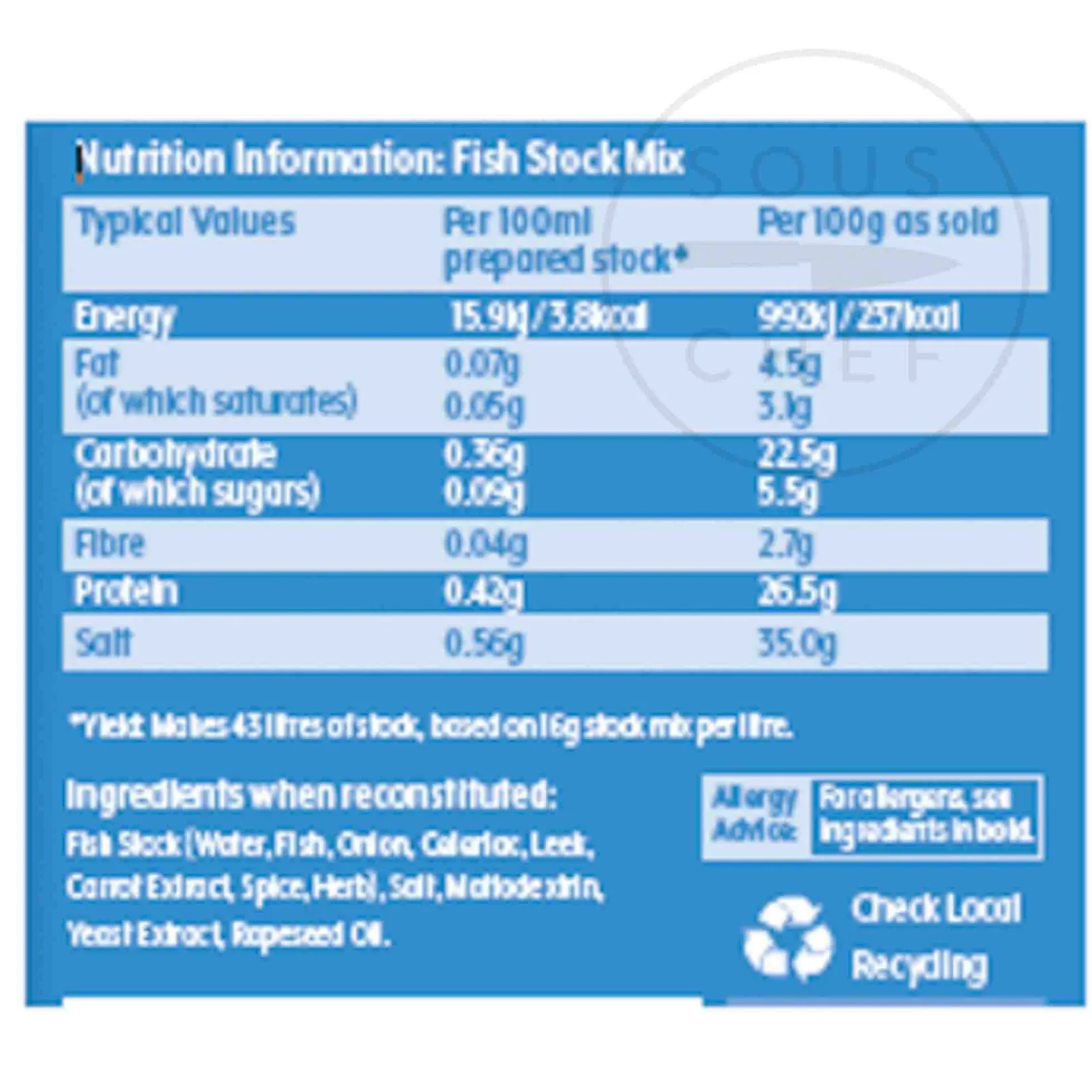 Essential Cuisine fish stock mix gives you the same pungency of fresh fish stock, in powder form. Simply add 16g of dry stock mix to 1 litre of boiling water for a strong stock to add to your sauces, soups, gratins and pies.