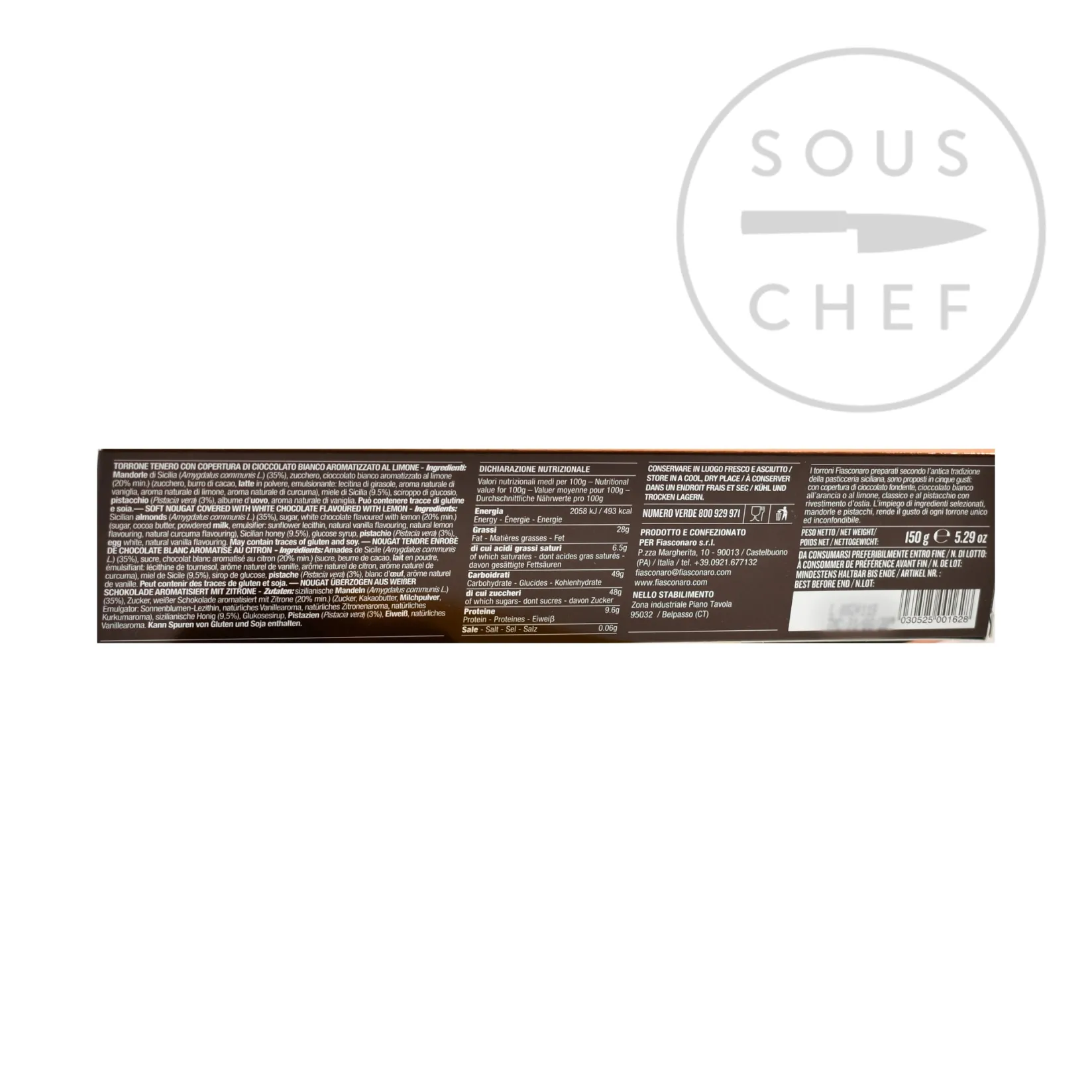 Fiasconaro Sicilian lemon torrone is a light, sweet treat that goes wonderfully with a cup of strong coffee. The soft nougat is packed with Sicilian almonds and pistachios. It’s coated with a thin layer of white chocolate that’s delicately flavoured with zesty lemon.