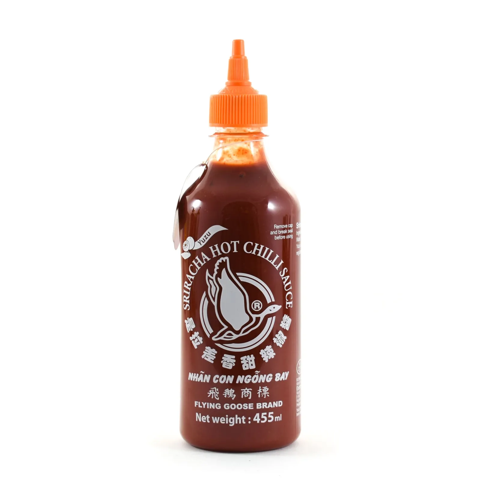 Flying Goose sriracha yuzu is a hot sauce with citrus, floral flavours. Chilli brings fiery heat, which is balanced with zingy yuzu juice and yuzu orange peel.