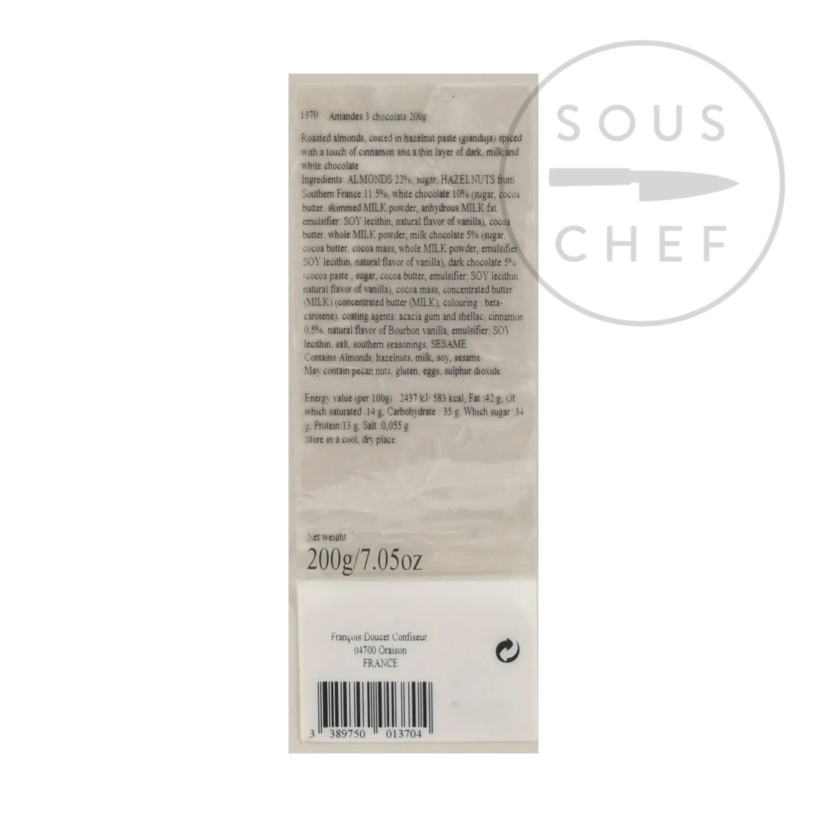 These Francois Doucet chocolate pralines are a selection of roasted almonds grown in Provence, coated in three different chocolates to create a glossy mix of rich browns. The almonds are wrapped in a layer of gianduja which is a hazelnut and chocolate mix, then lightly spiced with a touch of cinnamon.
