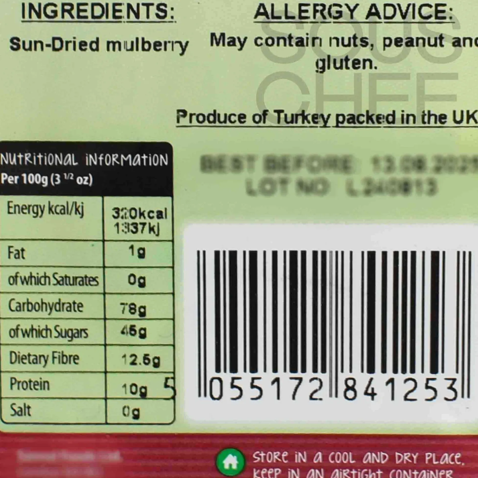 Product formulations and details may change. For the latest ingredients and allergen information always check product packaging prior to consumption. Ingredients: Dried mulberries (100%)