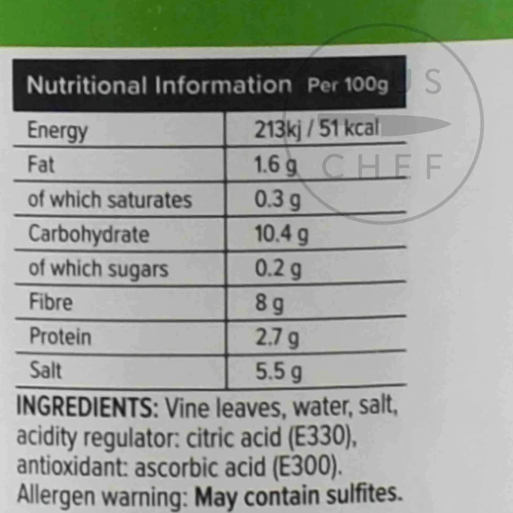 Product formulations and details may change. For the latest ingredients and allergen information always check product packaging prior to consumption. Ingredients: Vine leaves, water, salt, acidity regulator: citric acid (e330), antioxidant: ascorbic acid (e300).