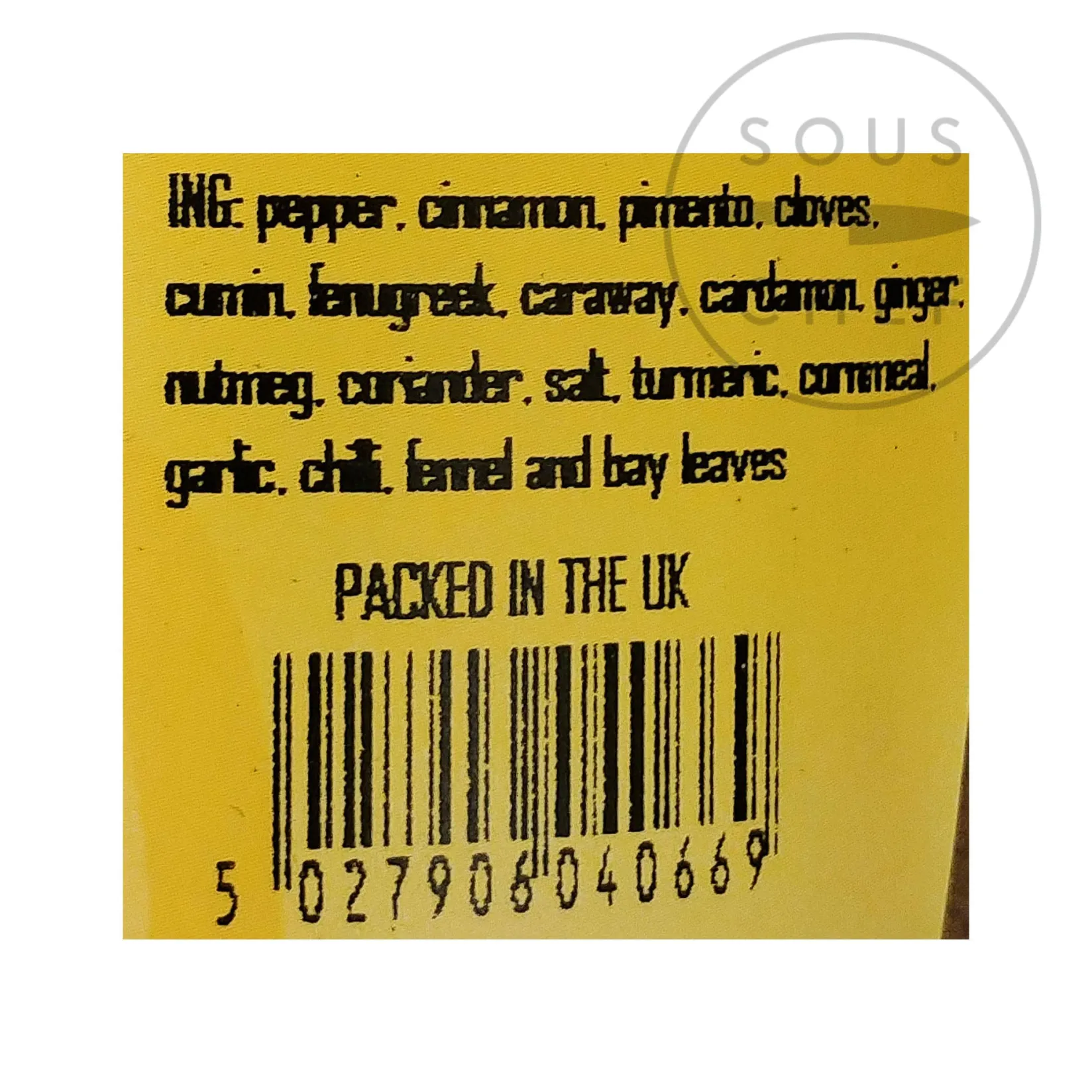 Product formulations and details may change. For the latest ingredients and allergen information always check product packaging prior to consumption. Ingredients: pepper, cinnamon, pimento, cloves, cumin, fenugreek, caraway, cardamom, ginger, nutmeg, coriander, salt, turmeric, cornmeal, garlic, chilli, fennel, bay leaves.