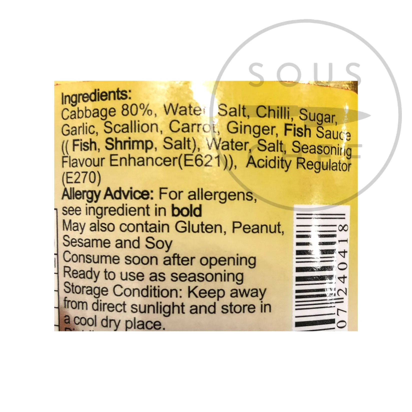 Product formulations and details may change. For the latest ingredients and allergen information always check product packaging prior to consumption. Ingredients: cabbage (80%,) water, salt, chilli, sugar, garlic, scallion (spring onion), carrot, ginger, fish sauce ([fish, shrimp, salt], water, salt, seasoning flavour enhancer [E621]), acidity regulator (E270).