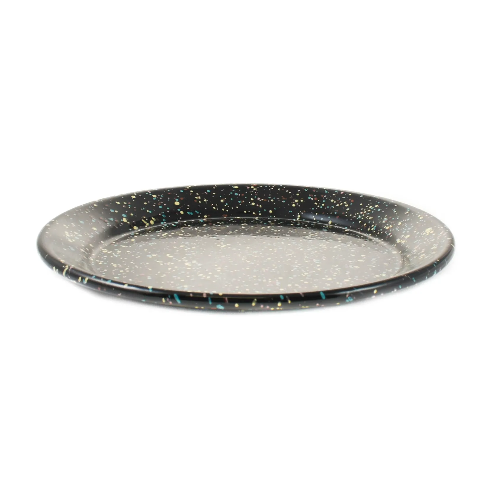 The galaxy splatter plate is a stunning piece of enamelware. The glossy black surface is covered in hundreds of colourful paint splatters. It resembles a starry night sky.