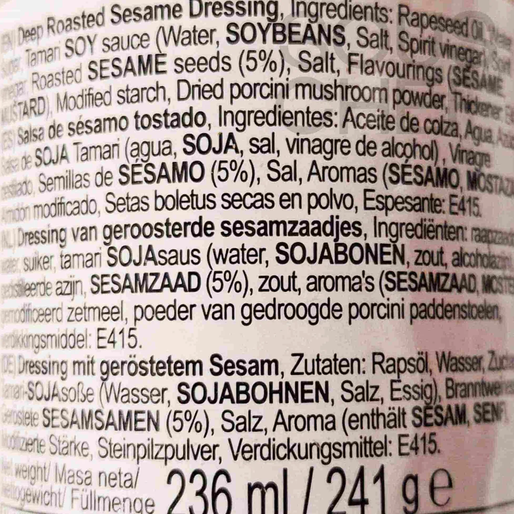 Product formulations and details may change. For the latest ingredients and allergen information always check product packaging prior to consumption. Ingredients: Rapeseed oil water, sugar, tamari soy sauce (water, soybeans, salt, spirit vinegar), spirit vinegar, roasted sesame seeds (5%), salt, flavouring (sesame, mustard), modified starch, dried porcini mushroom powder, thickener: e415.