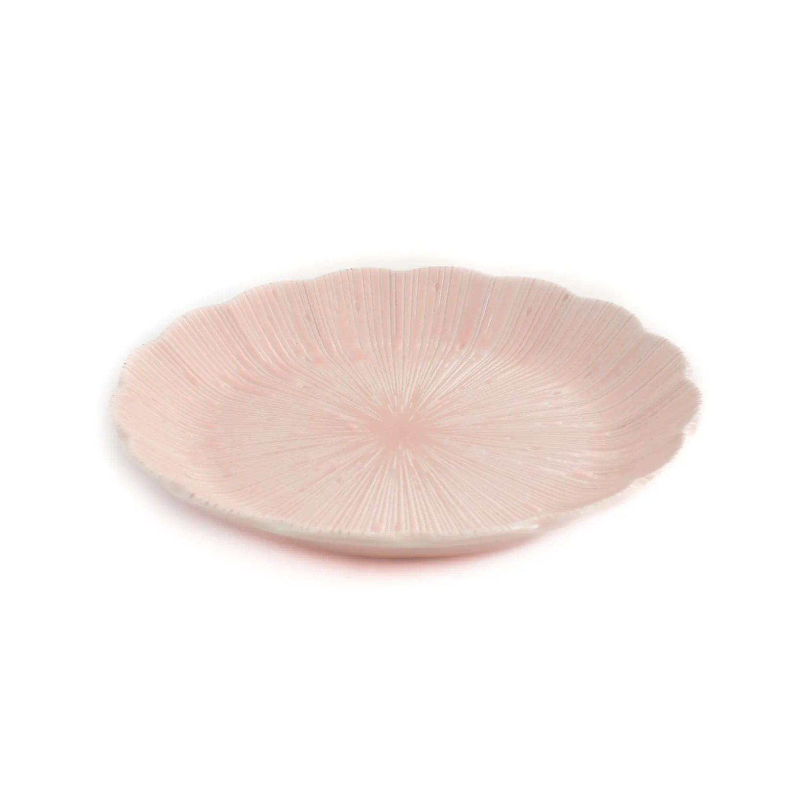 Use this pink scalloped plate to serve Japanese desserts and side dishes. The scalloped edges give it a unique, elegant appearance. The plate is pale pink at the edges with a darker shade at the centre. It is reminiscent of a delicate spring flower.