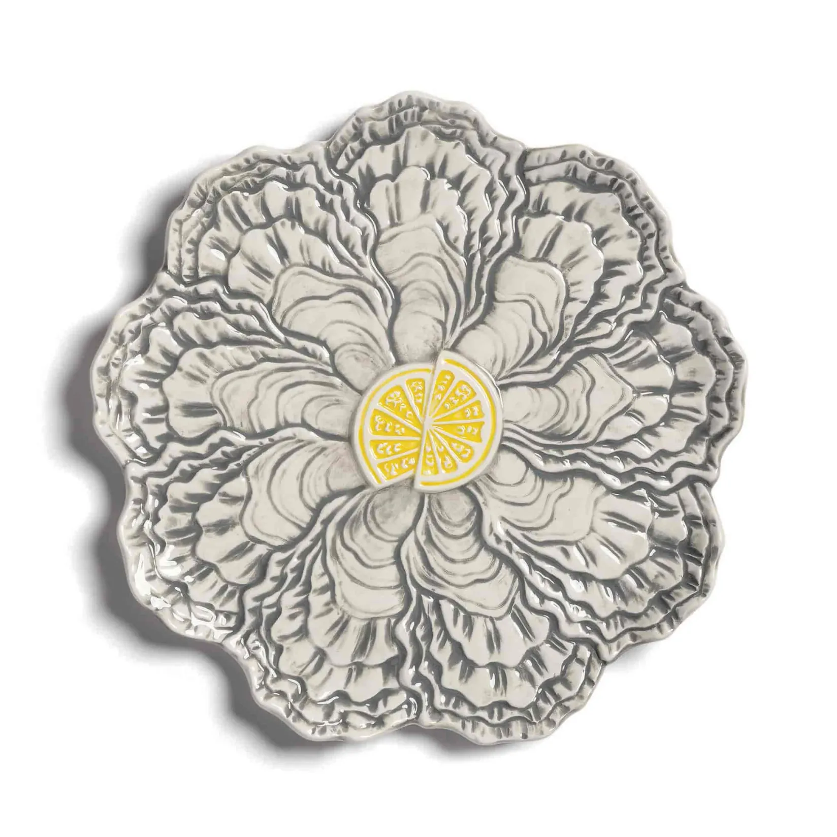 The hand-painted plate has a lifelike texture designed to resemble oyster shells. Vibrant yellow lemon wedges add a splash of colour to the centre.