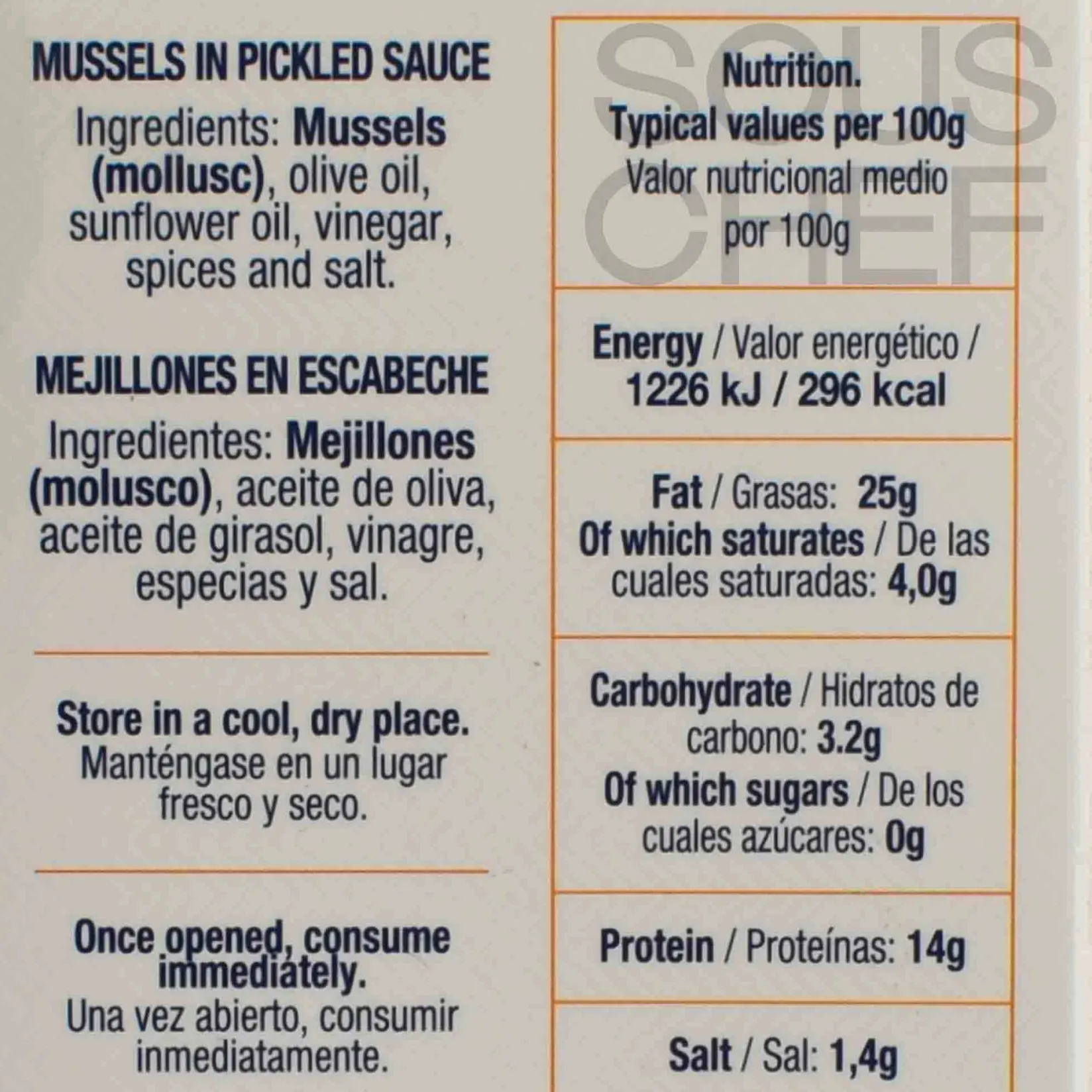 The mussels are packed in a classic escabeche sauce. Made with olive oil, vinegar, spices and salt, it has a distinctive sweet-sour flavour.