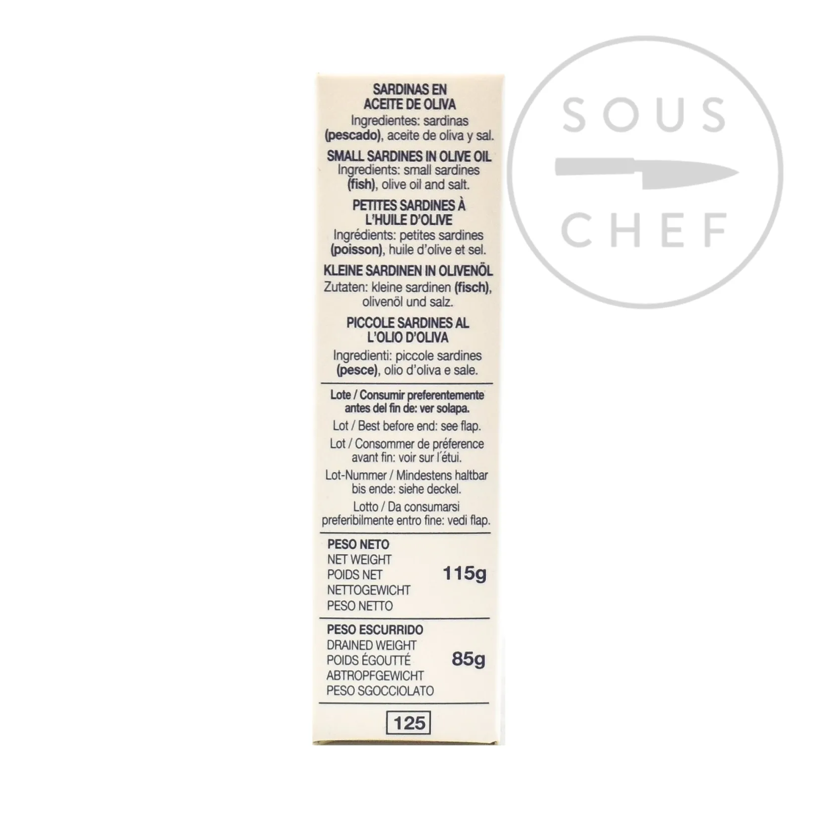 Product formulations and details may change. For the latest ingredients and allergen information always check product packaging prior to consumption. Ingredients: sardines (fish), olive oil, salt.