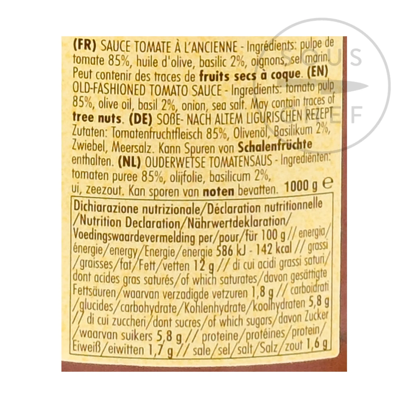 Product formulations and details may change. For the latest ingredients and allergen information always check product packaging prior to consumption. Ingredients: tomato pulp (85%), olive oil, basil (2%), onion, sea salt.