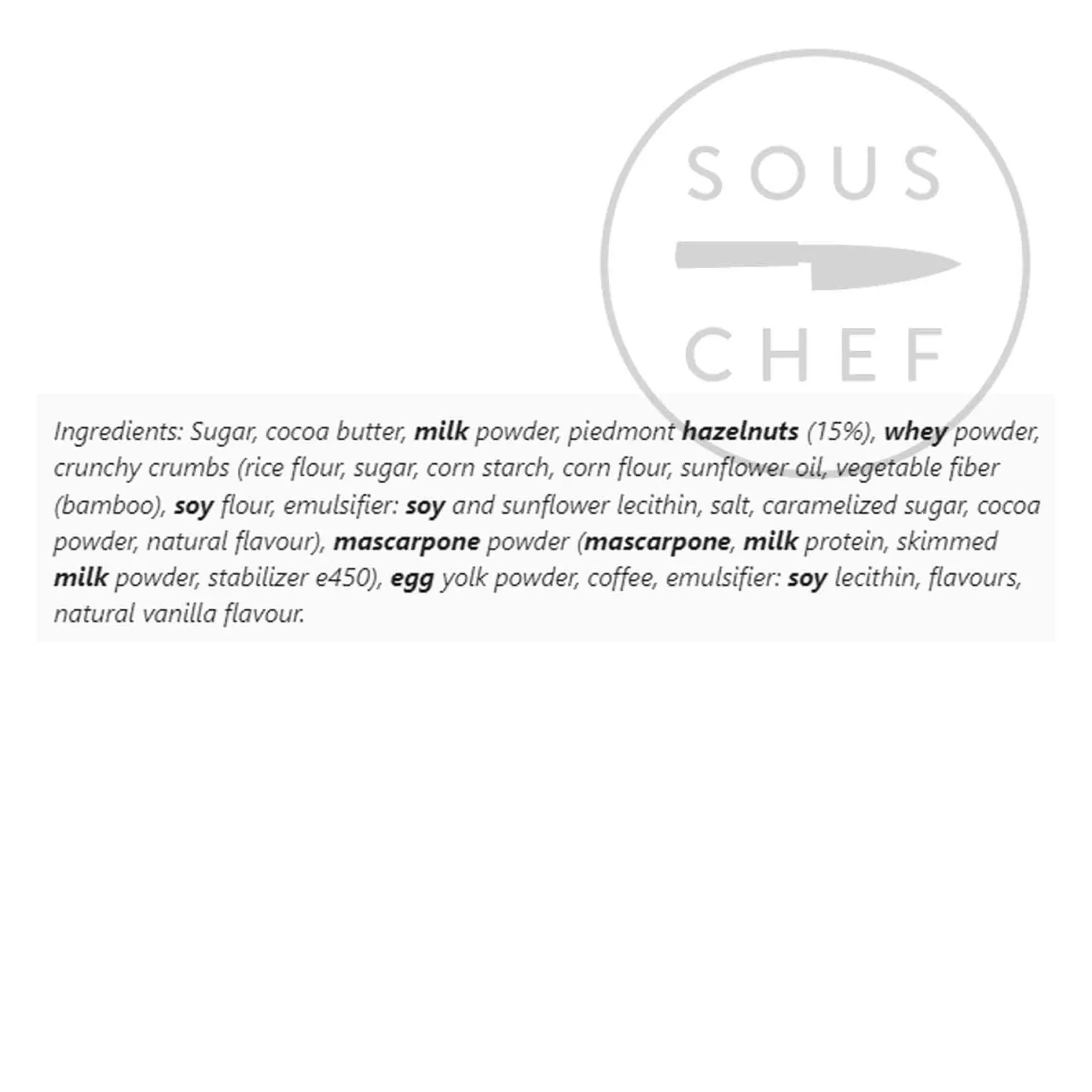 Product formulations and details may change. For the latest ingredients and allergen information always check product packaging prior to consumption. Ingredients: Sugar, cocoa butter, milk powder, piedmont hazelnuts (15%), whey powder, crunchy crumbs (rice flour, sugar, corn starch, corn flour, sunflower oil, vegetable fiber (bamboo), soy flour, emulsifier: soy and sunflower lecithin, salt, caramelized sugar, cocoa powder, natural flavour), mascarpone powder (mascarpone, milk protein, skimmed milk powder, stabilizer e450), egg yolk powder, coffee, emulsifier: soy lecithin, flavours, natural vanilla flavour.