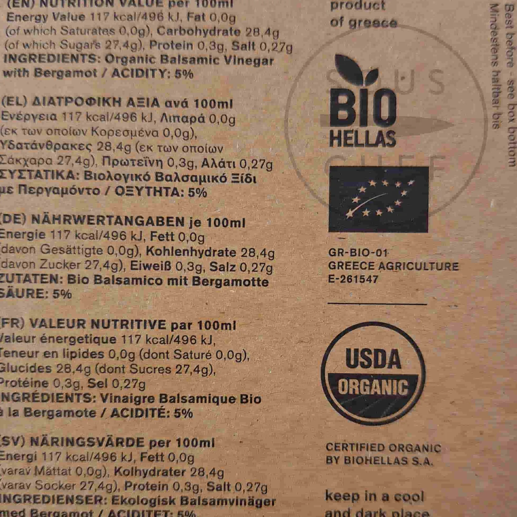 Product formulations and details may change. For the latest ingredients and allergen information always check product packaging prior to consumption. Ingredients: 70% organic red grape vinegar, 30% organic red grape, concentrated must and natural bergamot peels extract