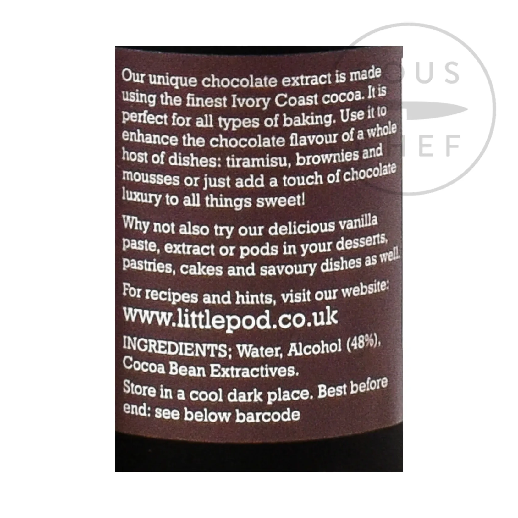 Littlepod pure chocolate extract is a natural flavouring made from Ivory Coast cocoa beans, used in tiramisu, brownies, sponges and mousses. This chocolate extract adds an extra chocolate intensity to make different desserts and puddings stand out from the crowd.