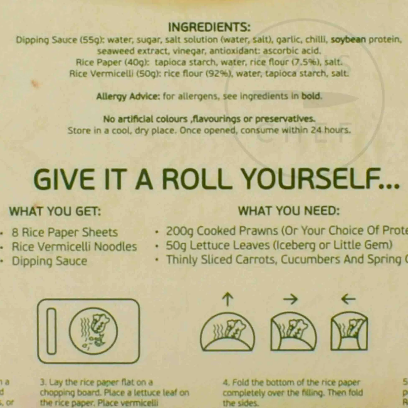Product formulations and details may change. For the latest ingredients and allergen information always check product packaging prior to consumption. Ingredients: Dipping sauce (55g): water, sugar, salt solution (water, salt), garlic, chilli, soybean protein, seaweed extract, vinegar, antioxidant: ascorbic acid. Rice paper (40g): tapioca starch, water, rice flour (7.5%), salt. Rice vermicelli (50g): rice flour (92%), water, tapioca starch, salt.