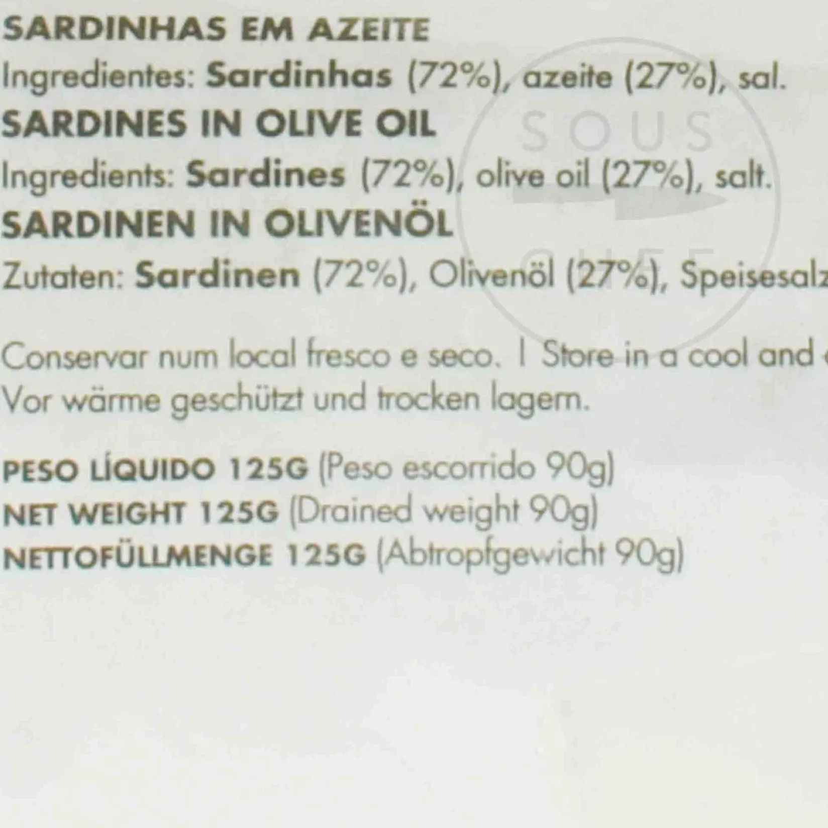 Product formulations and details may change. For the latest ingredients and allergen information always check product packaging prior to consumption. Ingredients: Sardines (72%), olive oil (27%), salt