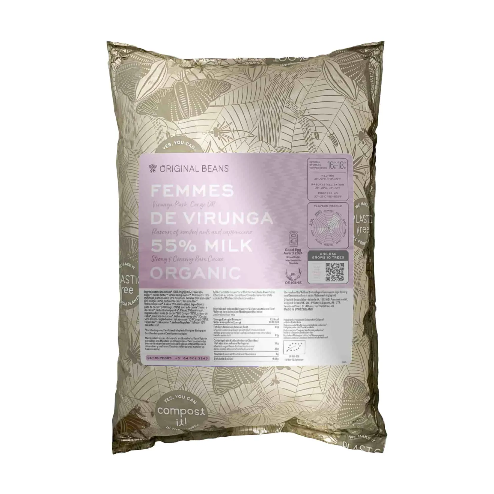 Original Beans 55% Femme de Virunga chocolate is creamy and complex. The dark milk chocolate has notes of coffee, caramel and roasted nuts. It’s a wonderful choice for coffee-flavoured pastries and desserts.