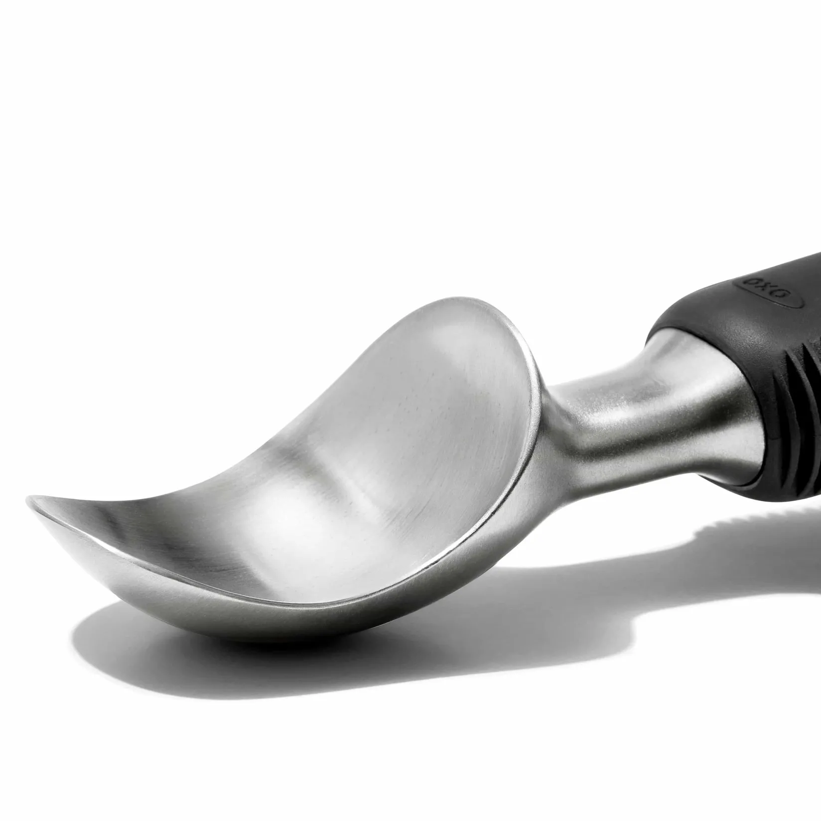 The Oxo Good Grips stainless steel ice cream scoop is a classic design, that produces perfect curls of ice cream. Use the sturdy spade-shaped spoon to serve ice cream, even straight from the freezer. The cushioned handle is comfortable to hold and will withstand considerable pressure.