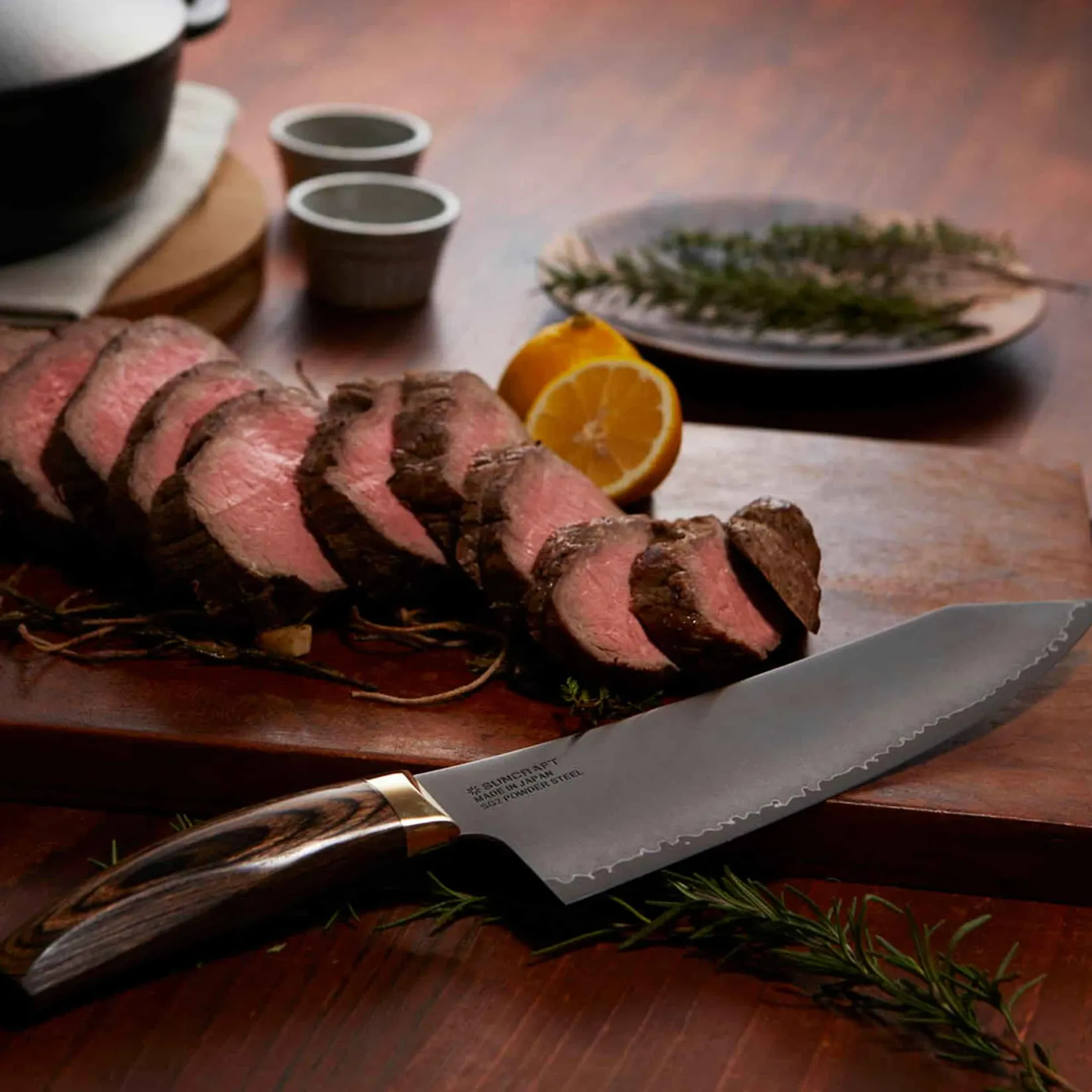 The 3 layered blade of the Seki Gyuto knife is made of premium quality SG2 powdered steel, which is layered with stainless steel for easy maintenance and a blade that will hold its edge for an incredibly long time. Along with the double bevelled point, this provides easy release when chopping for extra efficiency and smoothness.