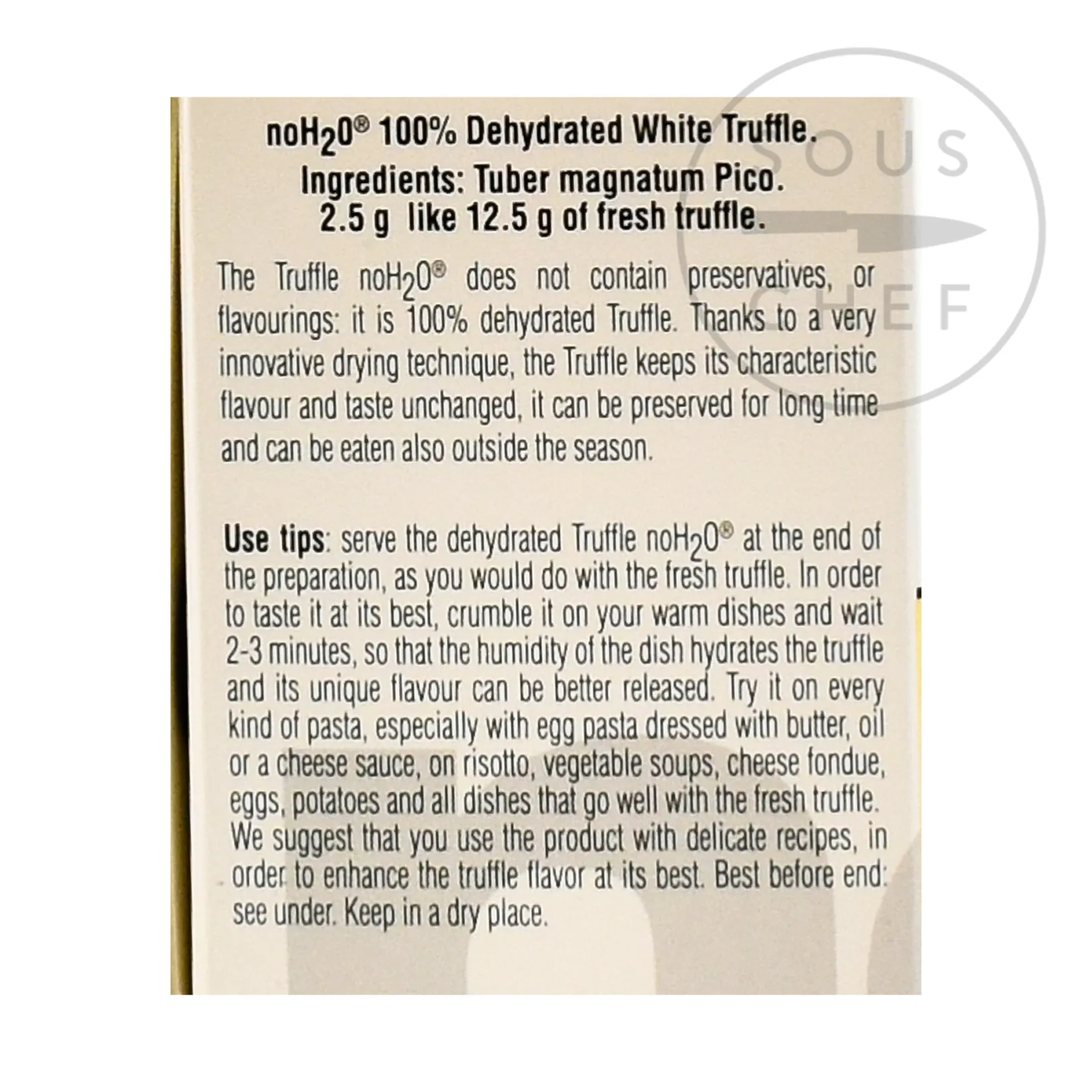 Product formulations and details may change. For the latest ingredients and allergen information always check product packaging prior to consumption. Ingredients: 100% dehydrated white truffle (Tuber magnatum Pico). 12.5g of fresh truffle per 2.5g of final product.