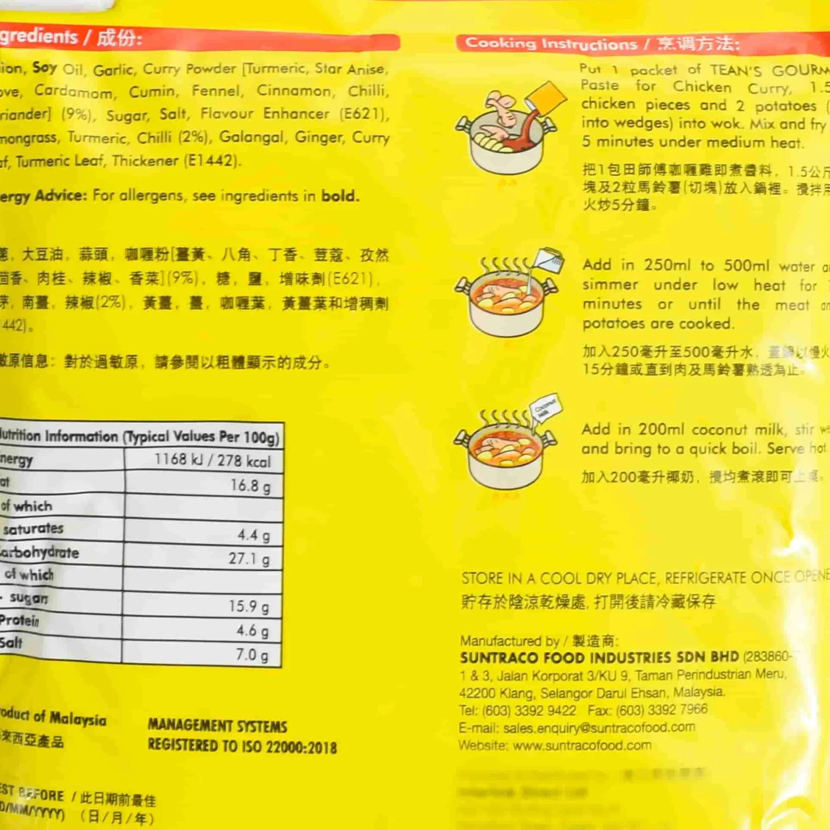 The paste has a rich, spicy taste and aroma. Lemongrass, curry leaves and galangal add layers of flavour to your curry. Curry powder and turmeric give it a traditional golden colour.