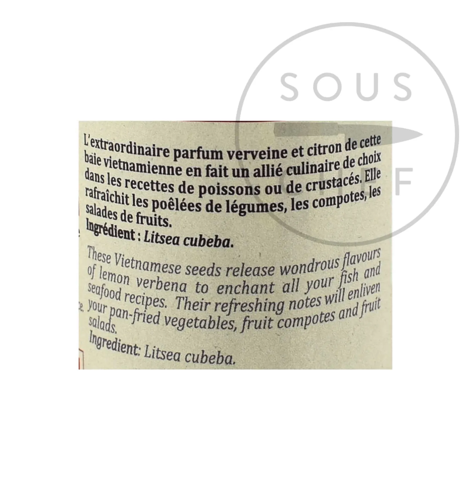 Terre Exotique’s verbena berry is a Vietnamese seed with a heady, floral flavour. Use them to add aroma and lemon flavour to fish and seafood dishes. Or sprinkle it into stir-fried vegetables. They also work well in sweet recipes, such as fruit compotes and even to flavour thick custards.