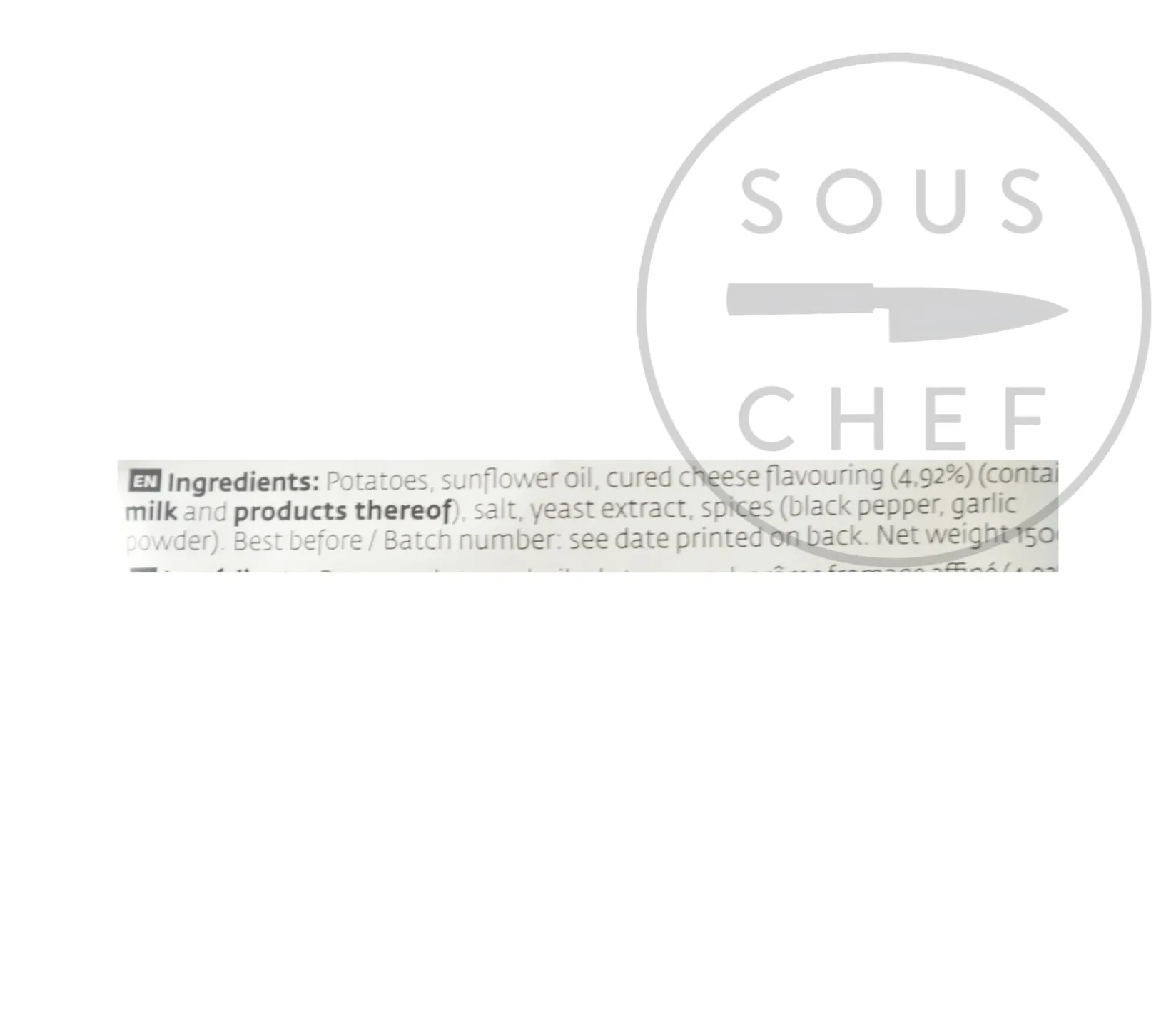 Product formulations and details may change. For the latest ingredients and allergen information always check product packaging prior to consumption. Ingredients: Potatoes, sunflower oil, cured cheese flavouring (4.92%) (contains milk and products thereof), salt, yeast extract, spices (black pepper, garlic powder)