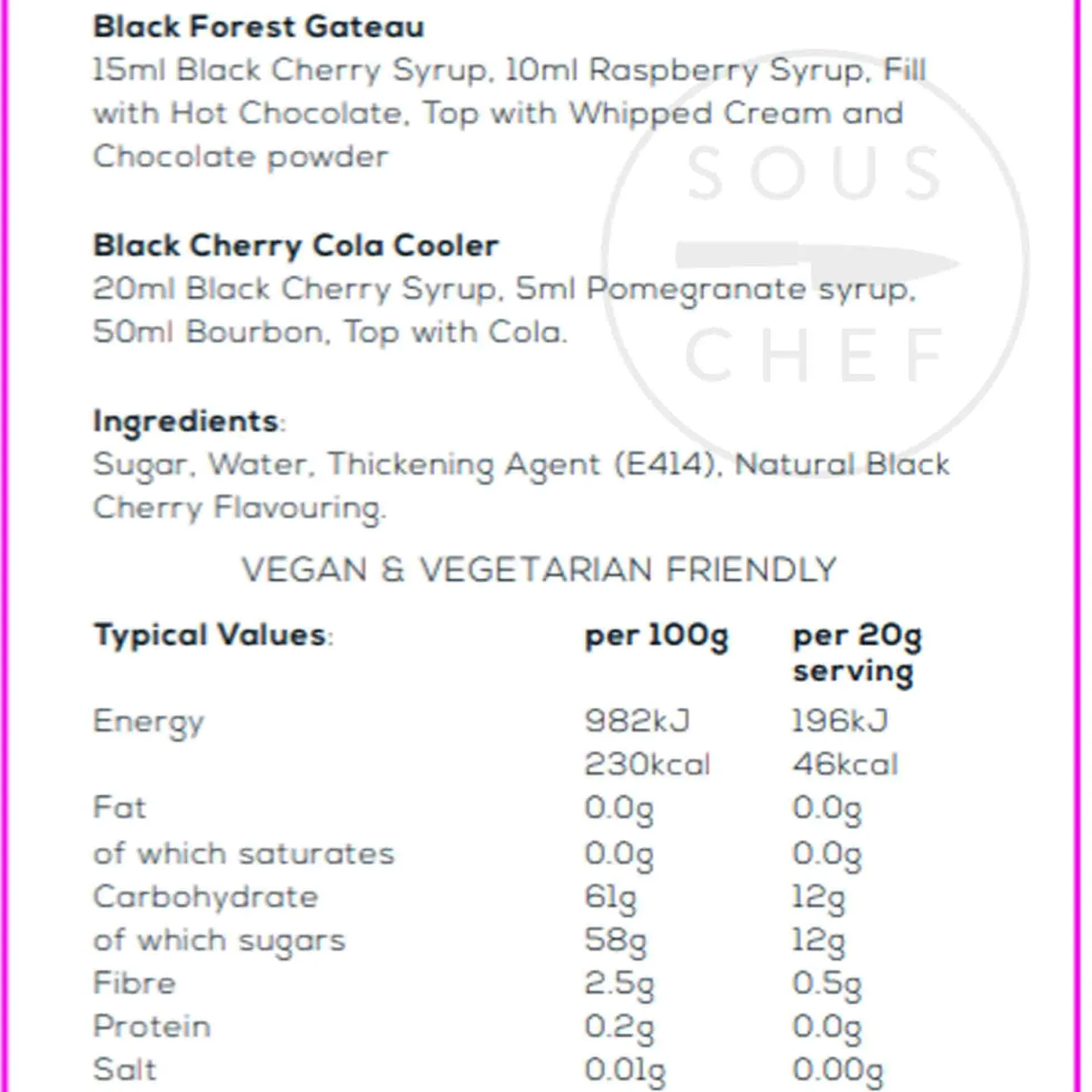 Product formulations and details may change. For the latest ingredients and allergen information always check product packaging prior to consumption. Ingredients: Sugar, water, emulsifier: acacia gum (E414), flavourings: natural black cherry flavouring