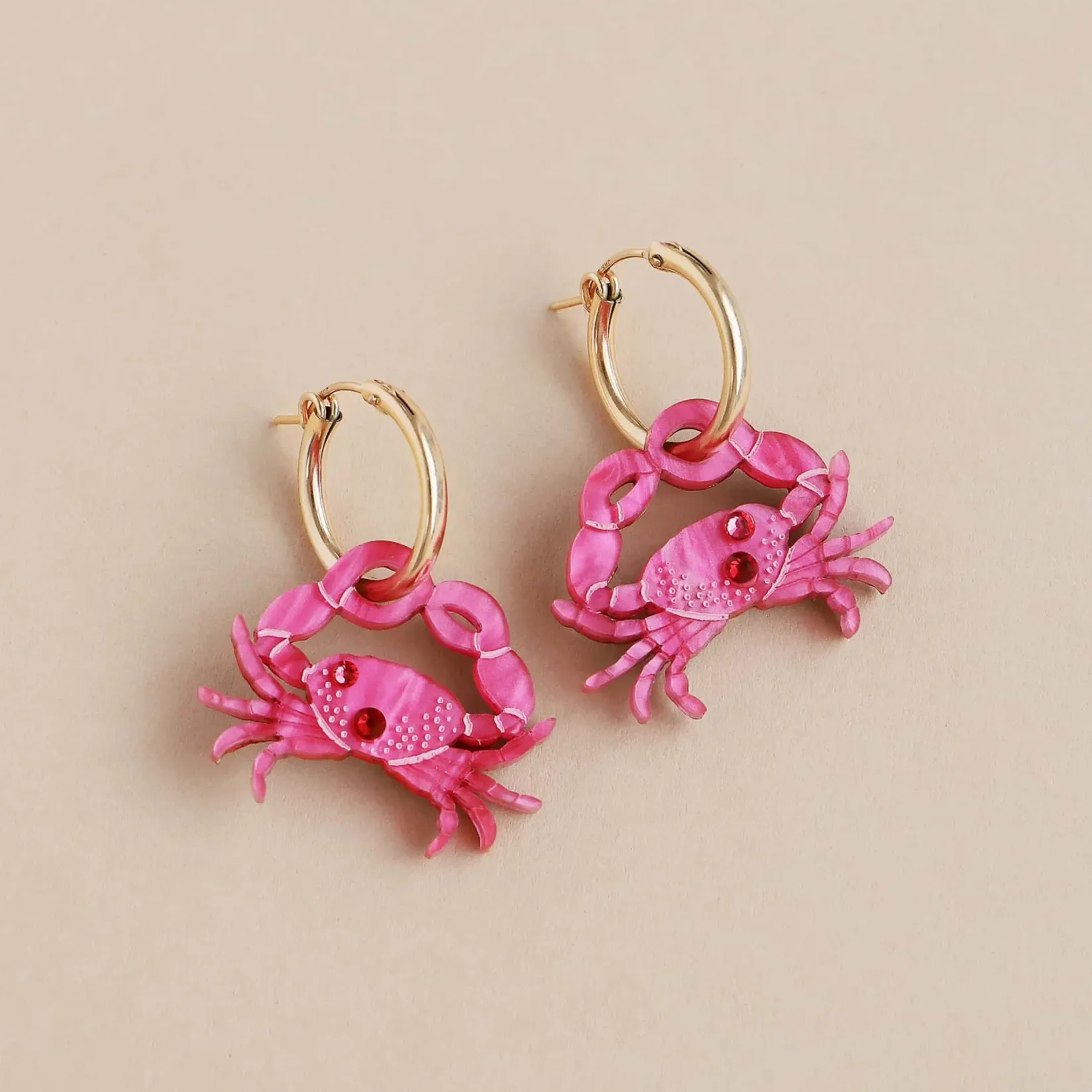 These pink crab earrings add a touch of fun to any outfit. They’re made from hot pink acrylic with delicate hand-inked detail. The crabs are suspended from gold-filled hoops by their claws.