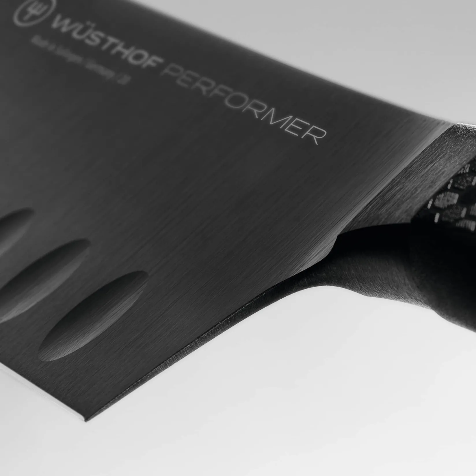 Forged from a single piece of WÜSTHOF steel by master artisans in Solingen, Germany, the Performer Santoku Knife boasts a black DLC (Diamond-Like Carbon) coating. This coating not only enhances the blade’s strength and durability but also ensures reduced friction, allowing it to effortlessly slice through a variety of ingredients with precision and ease.