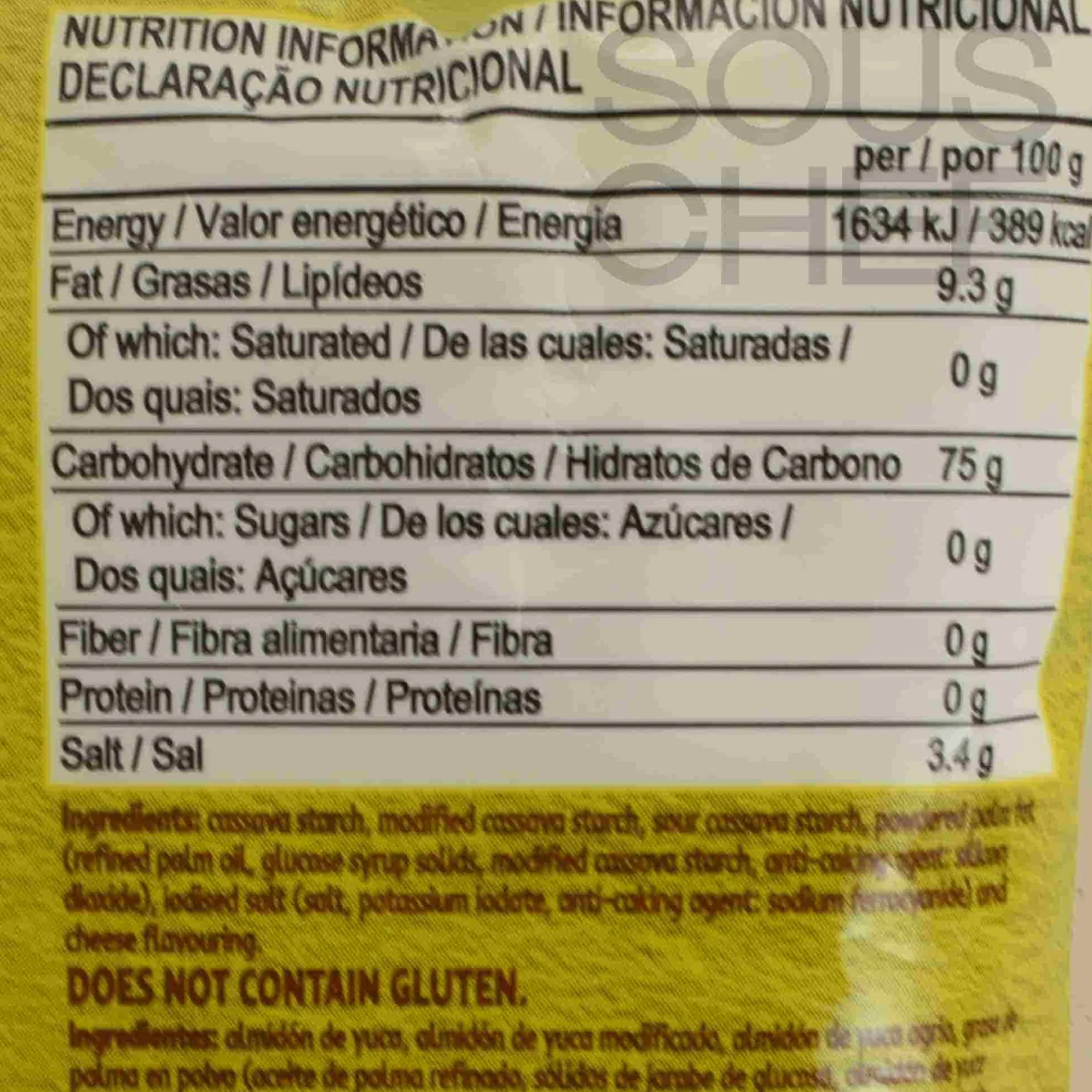 Product formulations and details may change. For the latest ingredients and allergen information always check product packaging prior to consumption. Ingredients: cassava starch, modified cassava starch, sour cassava starch, powdered palm fat (refined palm oil, glucose syrup solids, modified cassava starch, anti-caking agent: silicone dioxide), iodised salt (salt, potassium iodate, anti-caking agent: sodium ferrocyanide) and cheese flavouring.